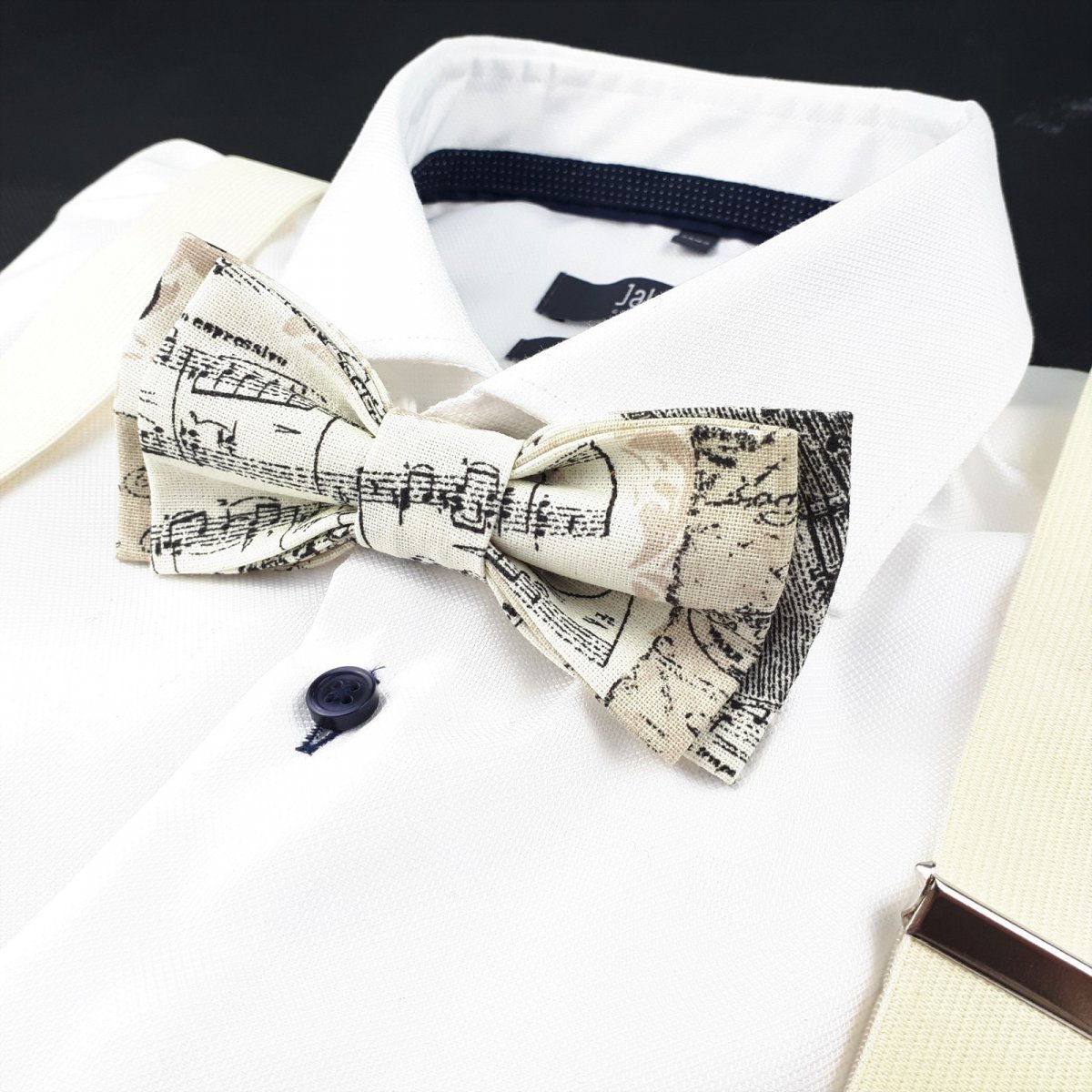 Tento krásny set motýlik a traky v klasickom štýle obsahuje bavlneného motýlika s hudobníckym motívom a kvalitným zapínaním, ktoré je možné nastaviť presne podľa veľkosti vášho krku. Traky sú béžovej farby, celogumené a veľkostne nastaviteľné tak, aby presne sadli na každý typ postavy. Traky sú tvaru X, a ich elasticita zabezpečuje pohodlné nosenie.