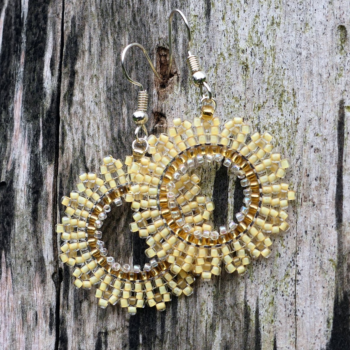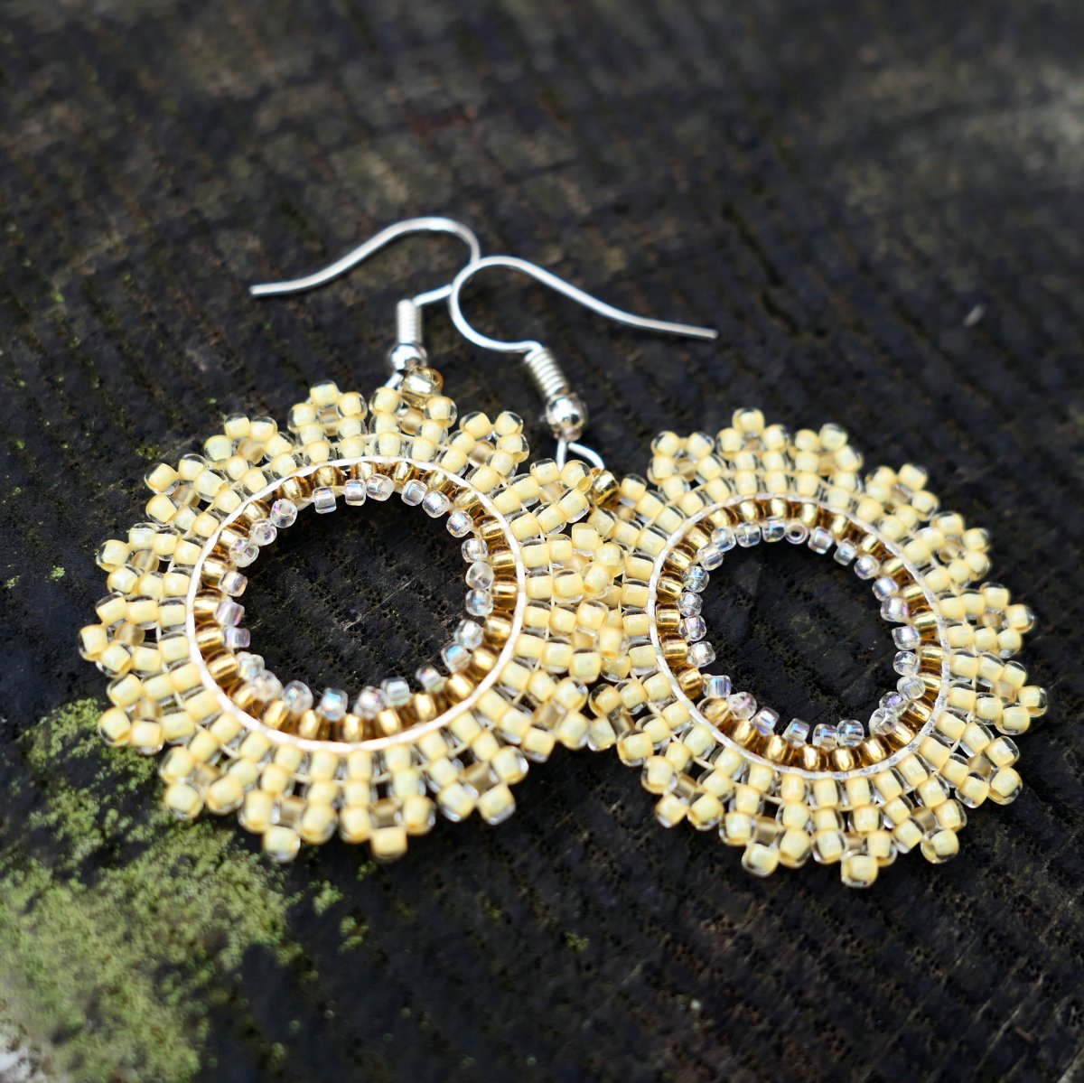 Šité náušničky průměru 3,2 cm, ušité do kovového kroužku, zavěšené na náušnicových háčcích stříbrné barvy, bez niklu. Zarážky součástí dodávky.