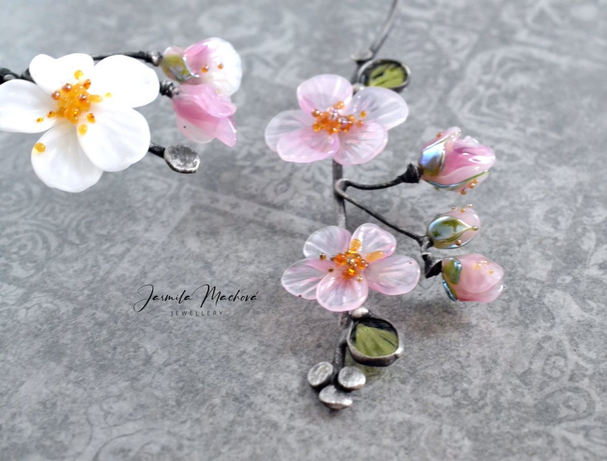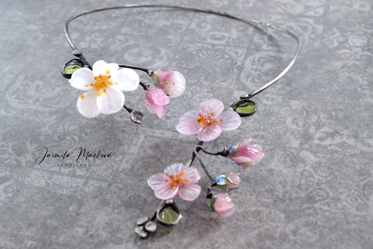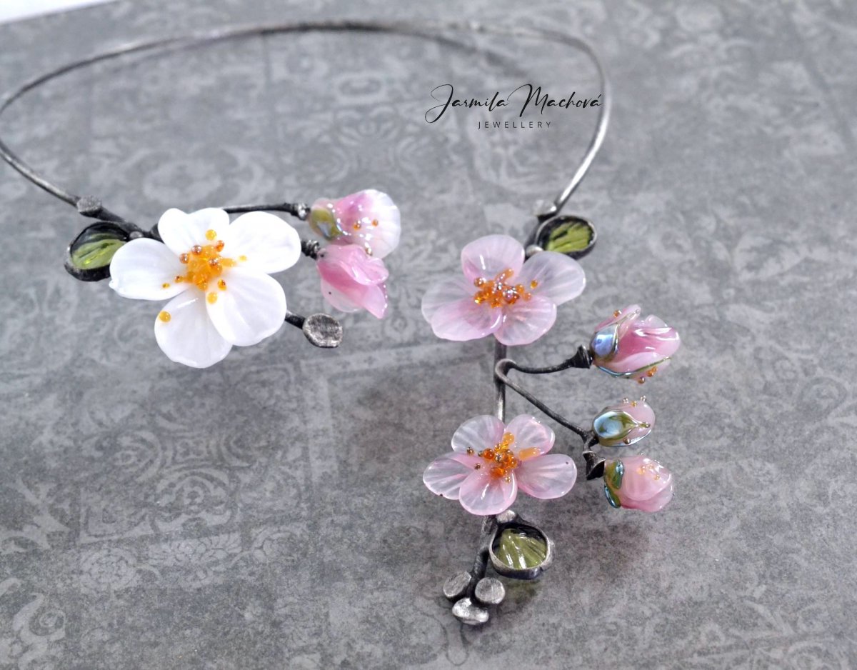 romantický náhrdelník se skleněnými květy šípkových růží....růžové barvy....ve spojení s cínovanou obručí