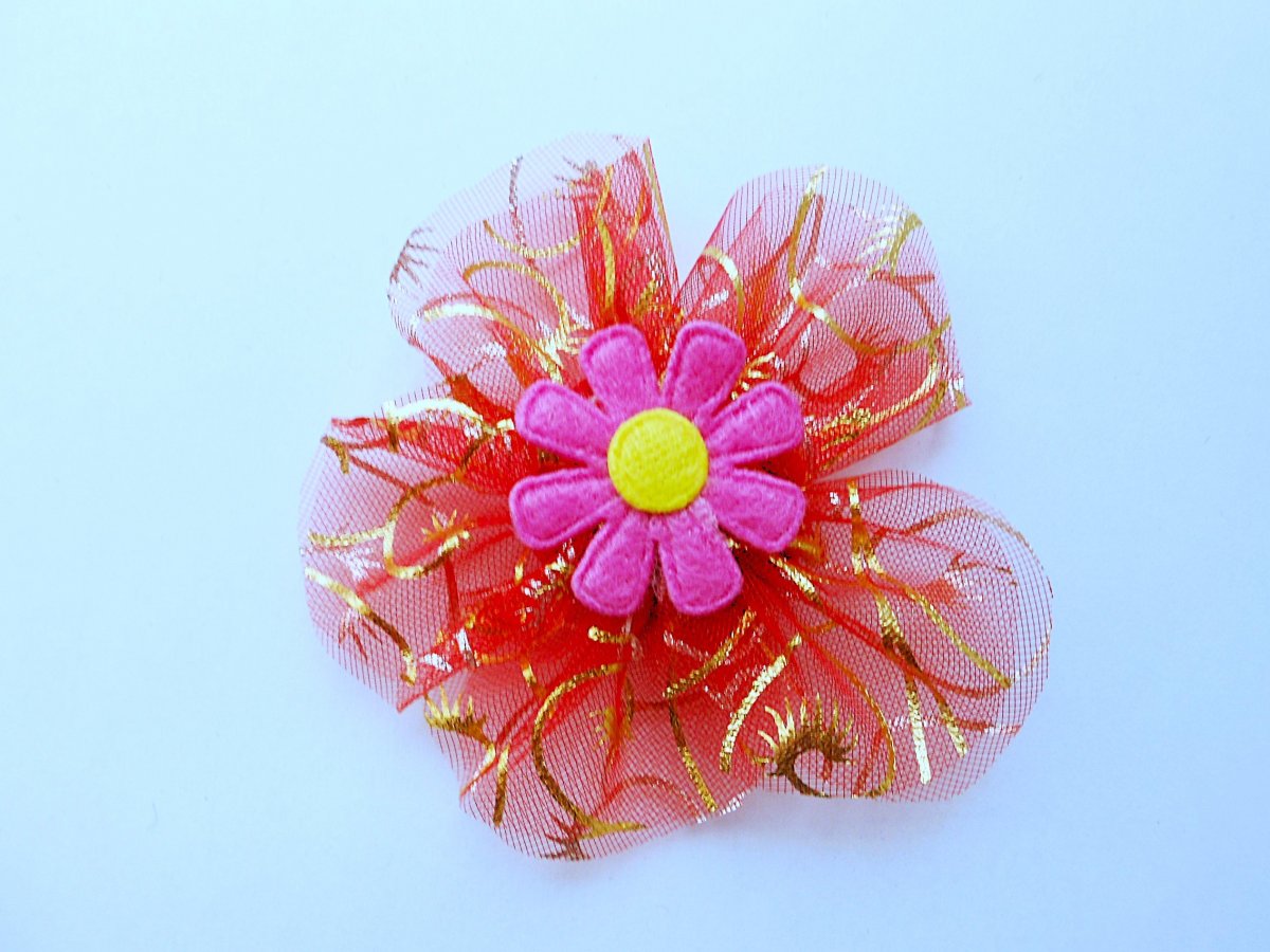 Šitá brož kytička, červeno-zlatá organza s růžovou kytičkou, průměr 7 cm, přišitý brožový můstek z bižuterního kovu.