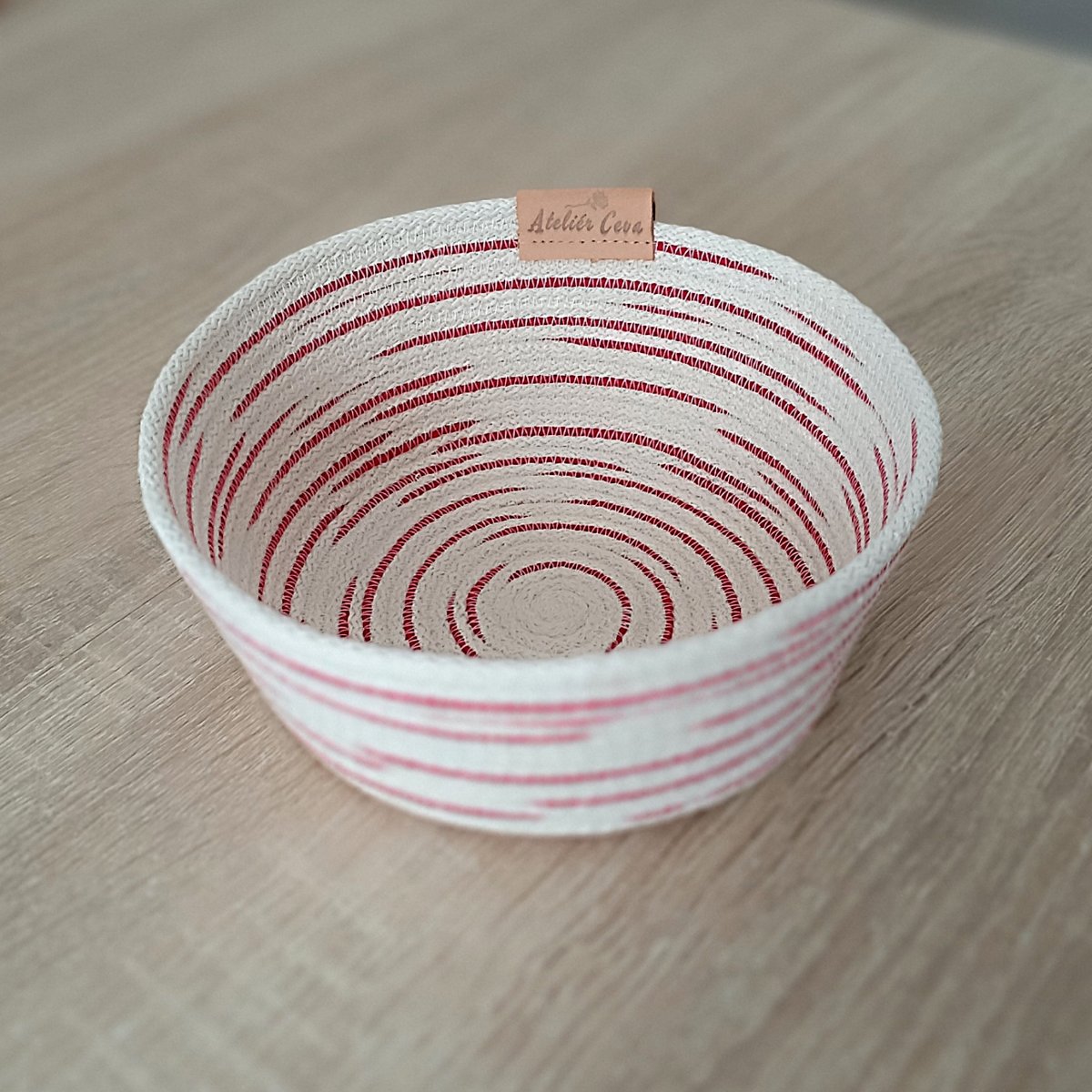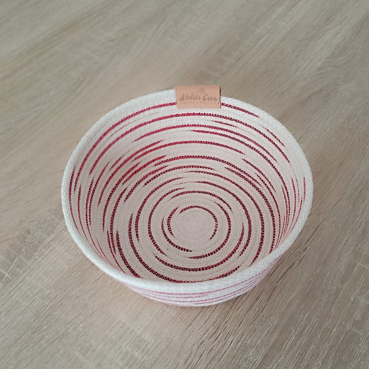 Ručně šitá miska je tvořena z pevných šňůr, které jí dodávají vysokou pevnost a schopnost držet tvar i při častém používání. Každý kus je originál, protože je šitá ručně s důrazem na detail a kvalitu zpracování.
