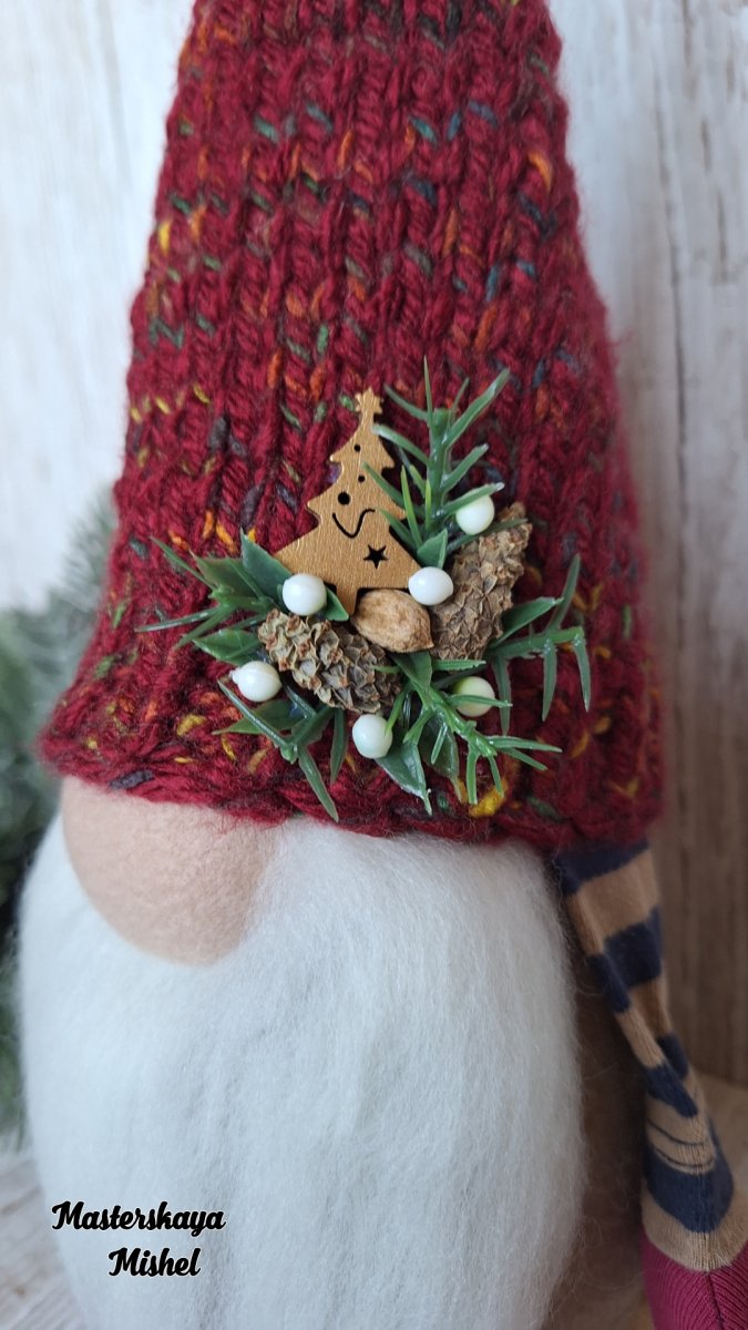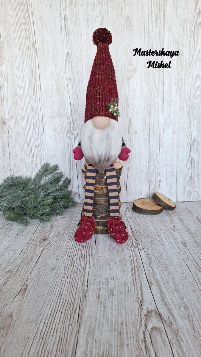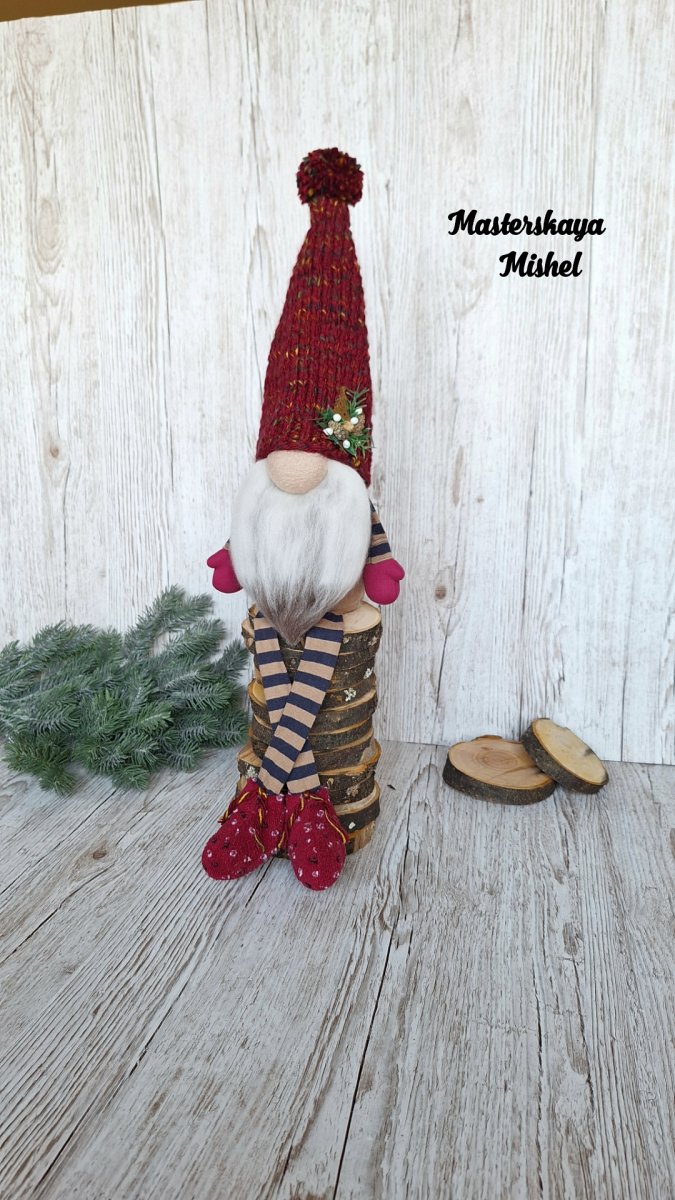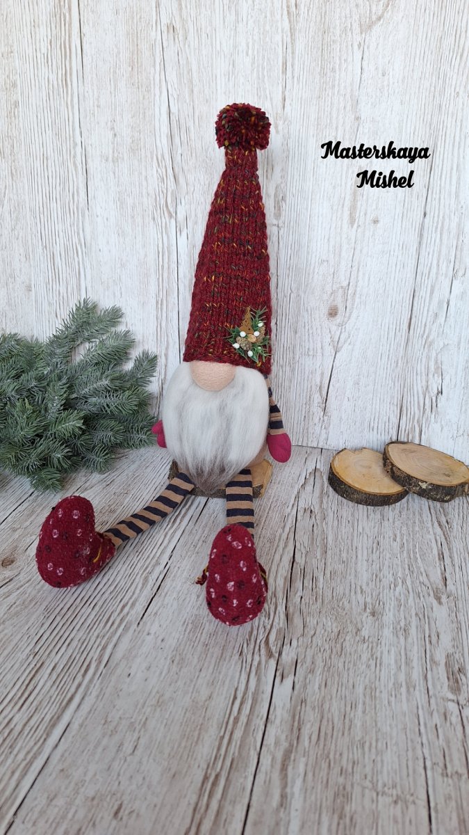 Skandinávský vánoční gnome s visícíma nohama, na sobě má vínové pletenou čepici s bambusovymi nitěmi.