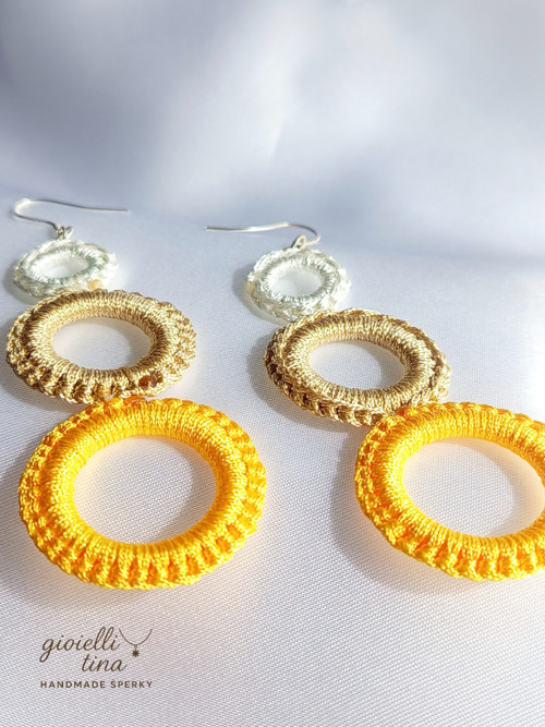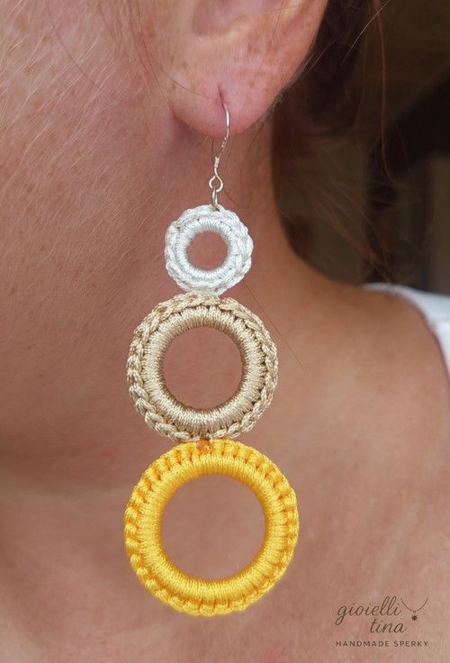 Tyto jedinečné náušnice značky gioielli tina jsou stvořené pro ženy, které milují minimalismus, ale zároveň se nebojí zaujmout. Tři ručně háčkované kruhy voskovými šňůrkami tvoří elegantní a moderní kaskádu, která dokonale podtrhne váš osobitý styl.