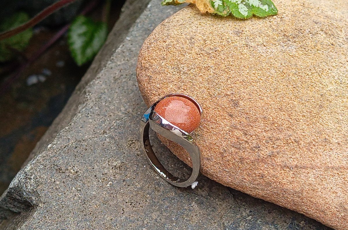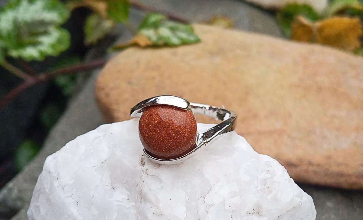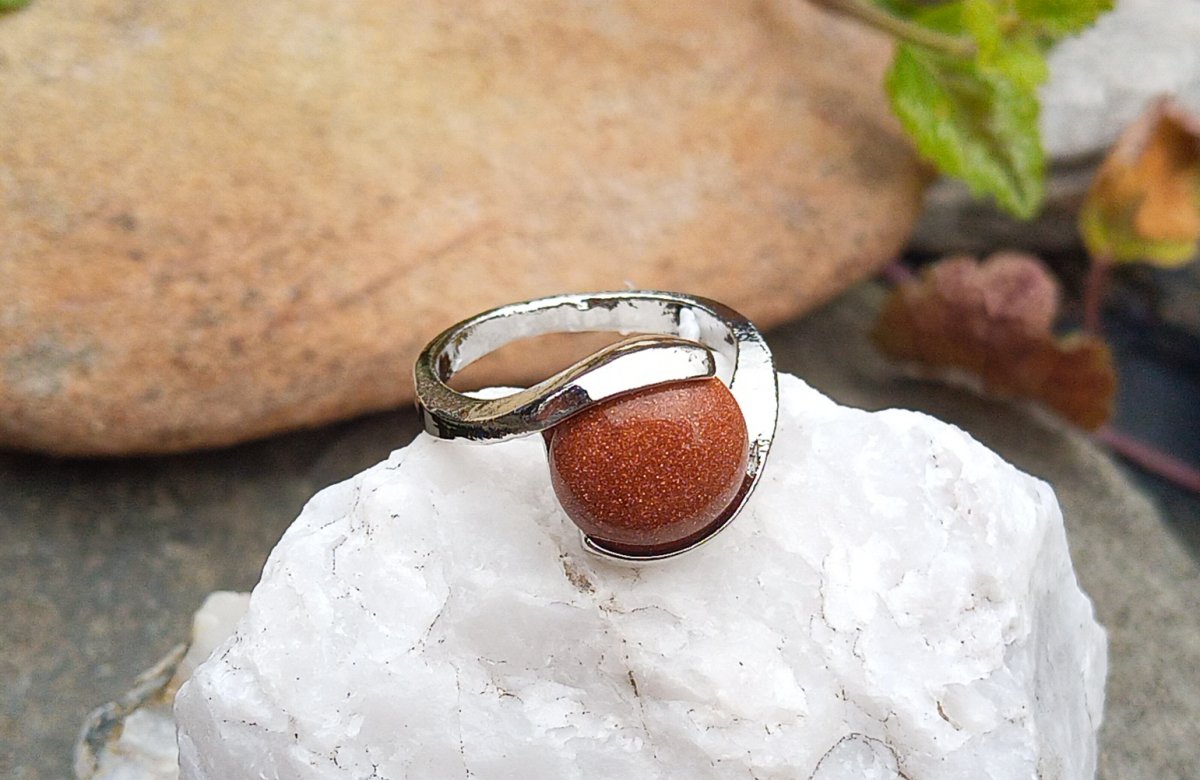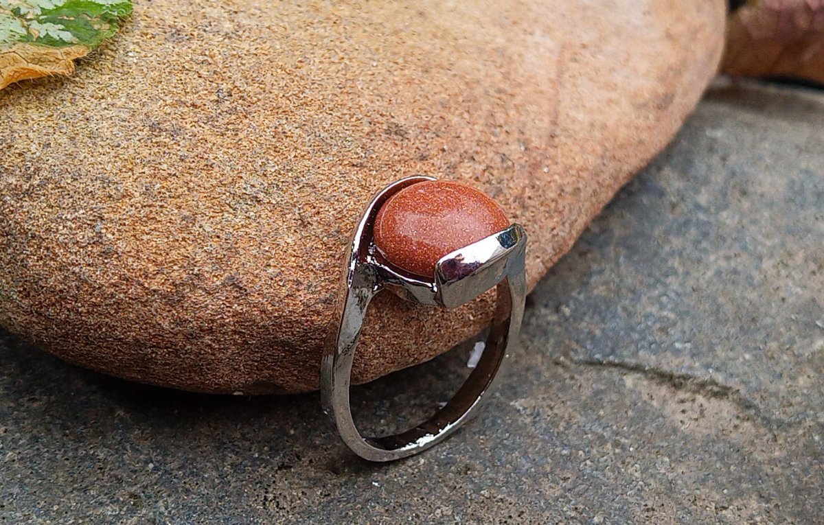 Třpytivý sluneční kámen zlatý avanturín o průměru 12 mm v elegantním postříbřeném kroužku, který kámen jakoby objímá. Nádherně zbarvený minerál, který rozzáří prst, který bude zdobit