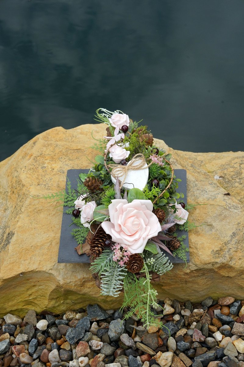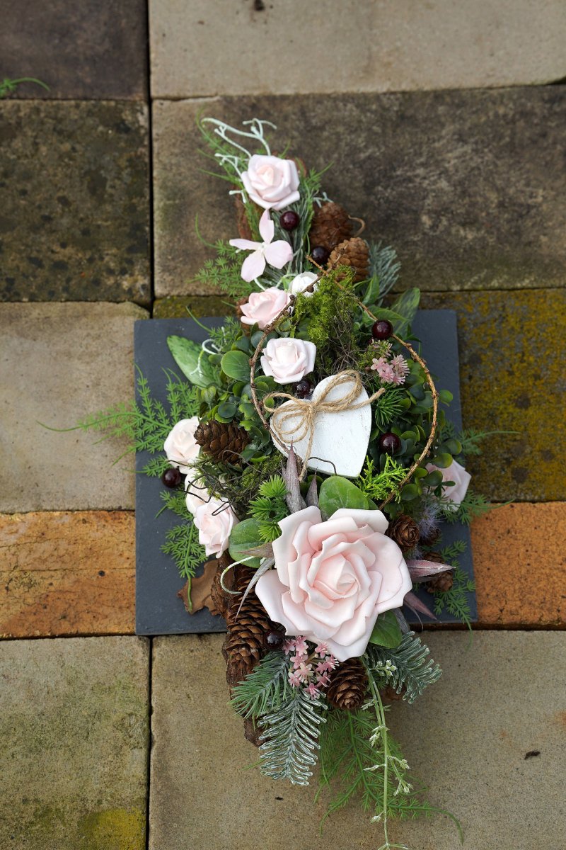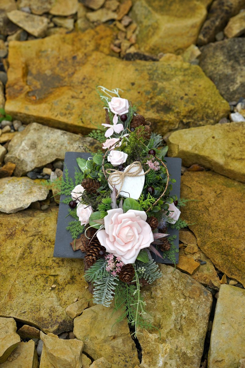 Dlouhá dekorace na hrob umístěná na břidlicové podložce. Rozměr dekorace je 53x24x10cm.