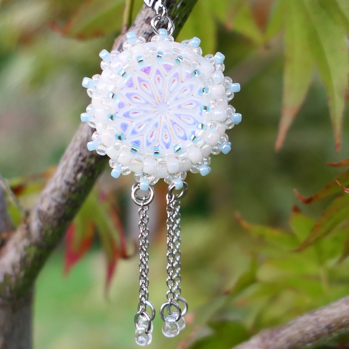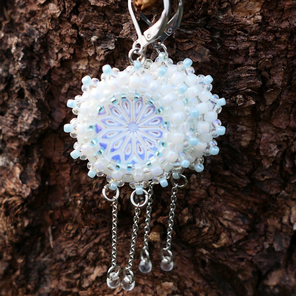 Šité náušnice s plochým penízkem s motivem květiny - zatíraným sklem Rutkovsky v barvě bílé s celopokovem AB (povrchová úprava Crystal Matted AB). Jsou oboustranné, obšité japonským rokailem TOHO v barvě bílé a čiré s listrem a AB pokovem v kombinaci s něžně modrou. Náušnice jsou doplněny nerez řetízky s mačkanými kapkami.