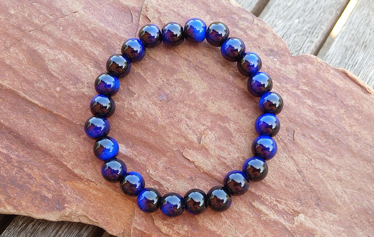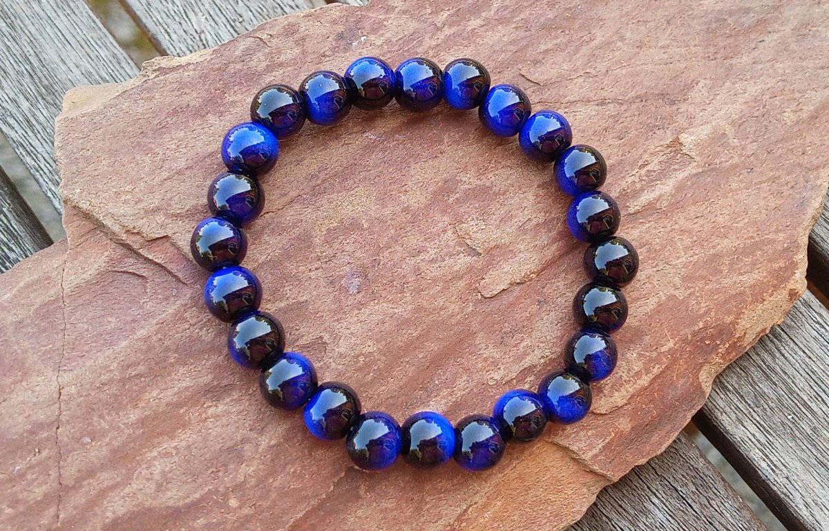 Minerálový pružný náramek vyrobený z nádherně duhového sokolího oka o průměru 8 mm. Elegantní náramek vhodný ke každé příležitosti v krásné modré duhové barvě.