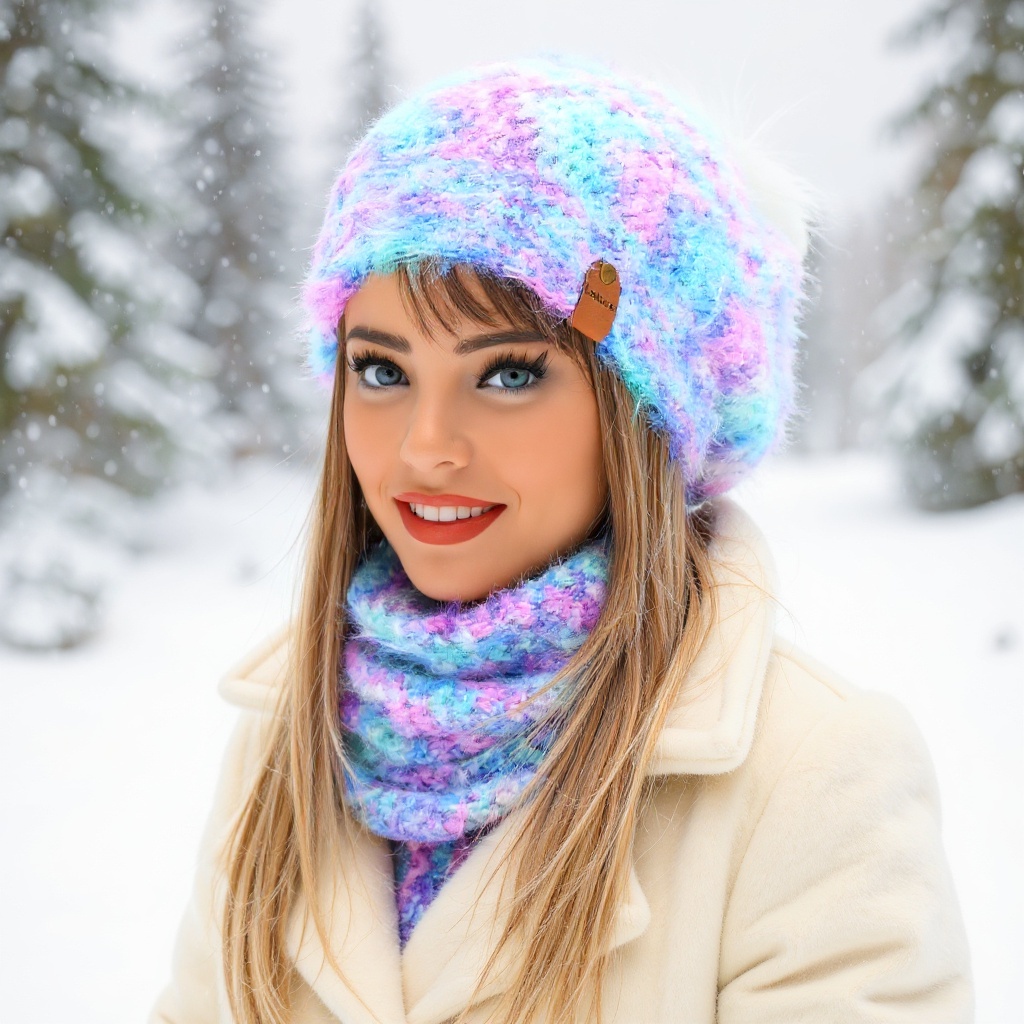 Čepice i nákrčník jsou háčkovány ze směsové příze s vysokým podílem merina (60 %) doplněné o nylon (40 %). Čepice je baretková, má bambuli z imitace kožešiny v bílé barvě a působí velmi žensky.