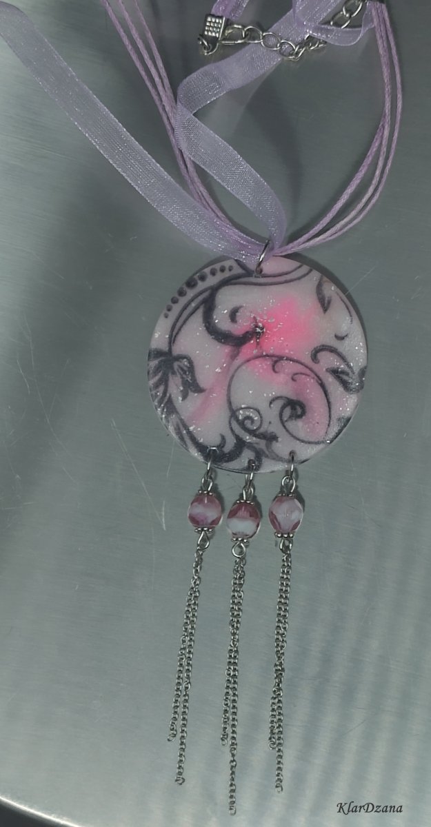 Barva polymerových částí: směs růžových odstínů, s lehkým třptem stříbrných plátků a černým potiskem, zdaní barvě není potištěná. Světle fialová stužka s voskovanými šňůrkami, zapínání na karabinku.