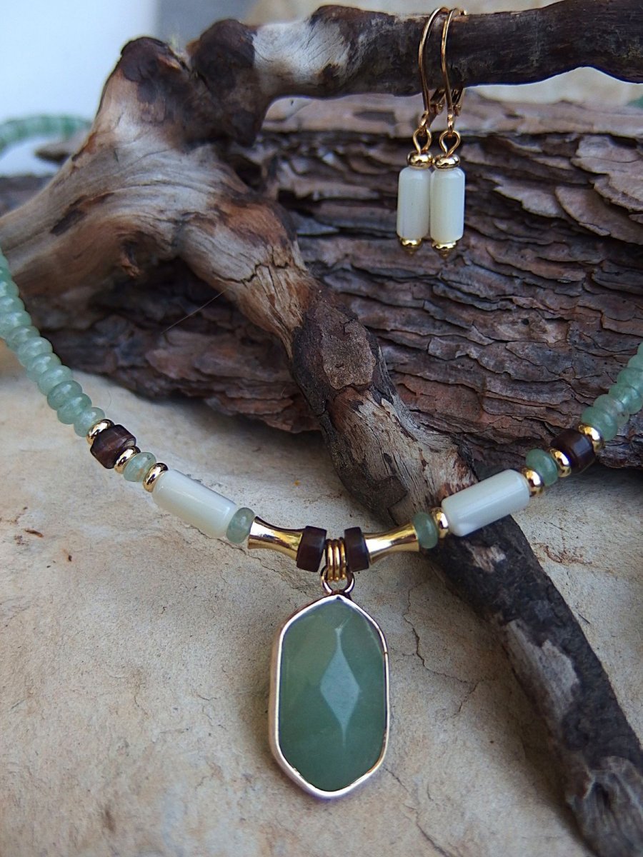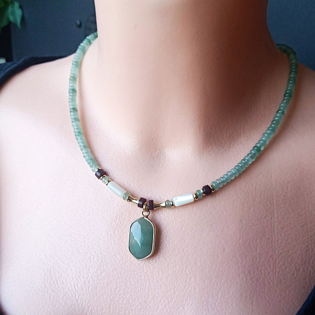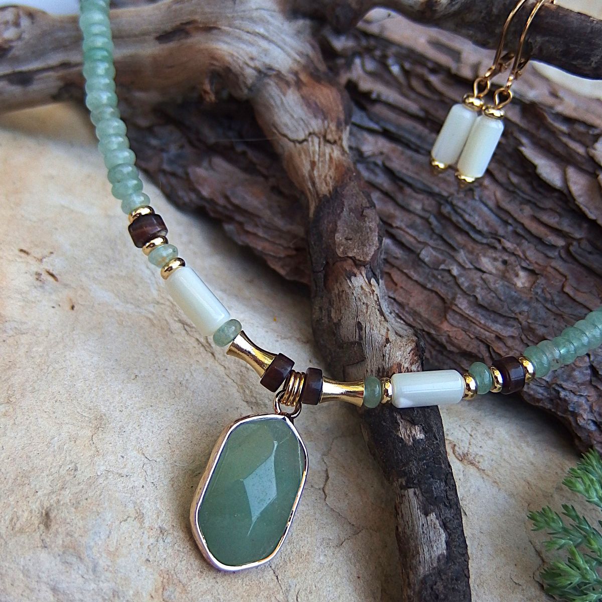 Zelený avanturín a jemná perleť se v tomto šperku potkávají v harmonii přírody a světla. Avanturín přináší klid, naději a otevřenost srdce – pomáhá uvolnit napětí a znovu nalézt důvěru v život. Perleť vnáší do této energie jemnost, ženskou intuici a tichou sílu klidu. Společně tvoří vyrovnanou melodii, která vede k vnitřní rovnováze a obnově energie.