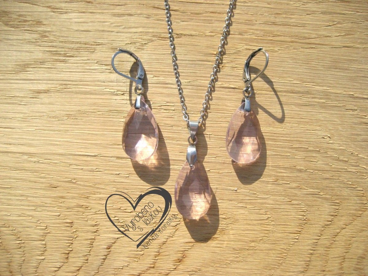 Jednoduchá a zároveň velmi elegantní sada z nerez oceli - řetízek 45cm a visací náušnice s uzavíratelným háčkem - přívěsek kapka 2,6x1,8 cm, přívěsky jsou z broušeného skla v růžové čiré barvě, součástí sady je dárková krabička