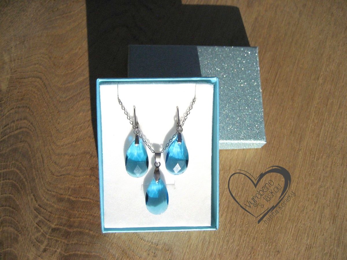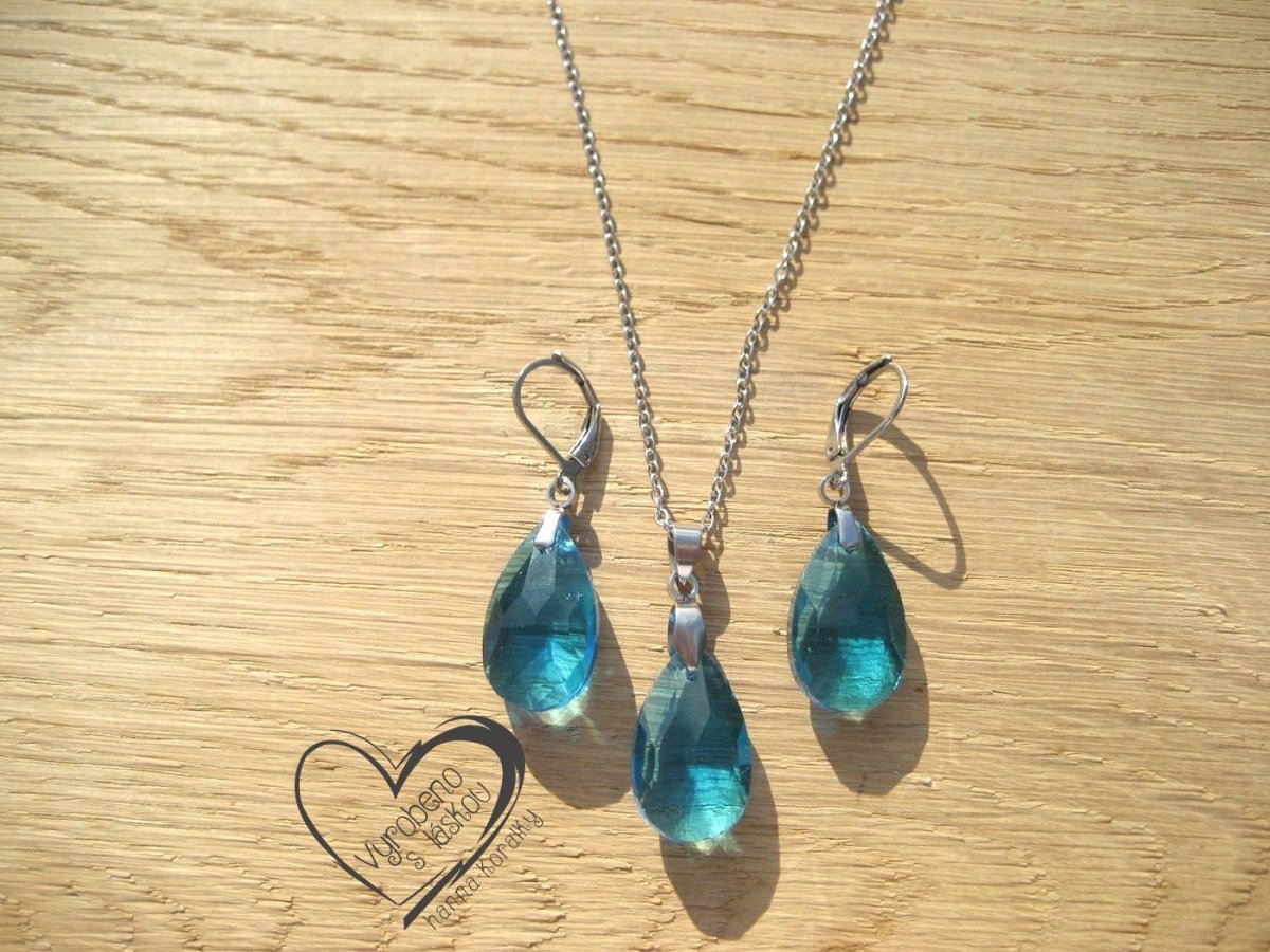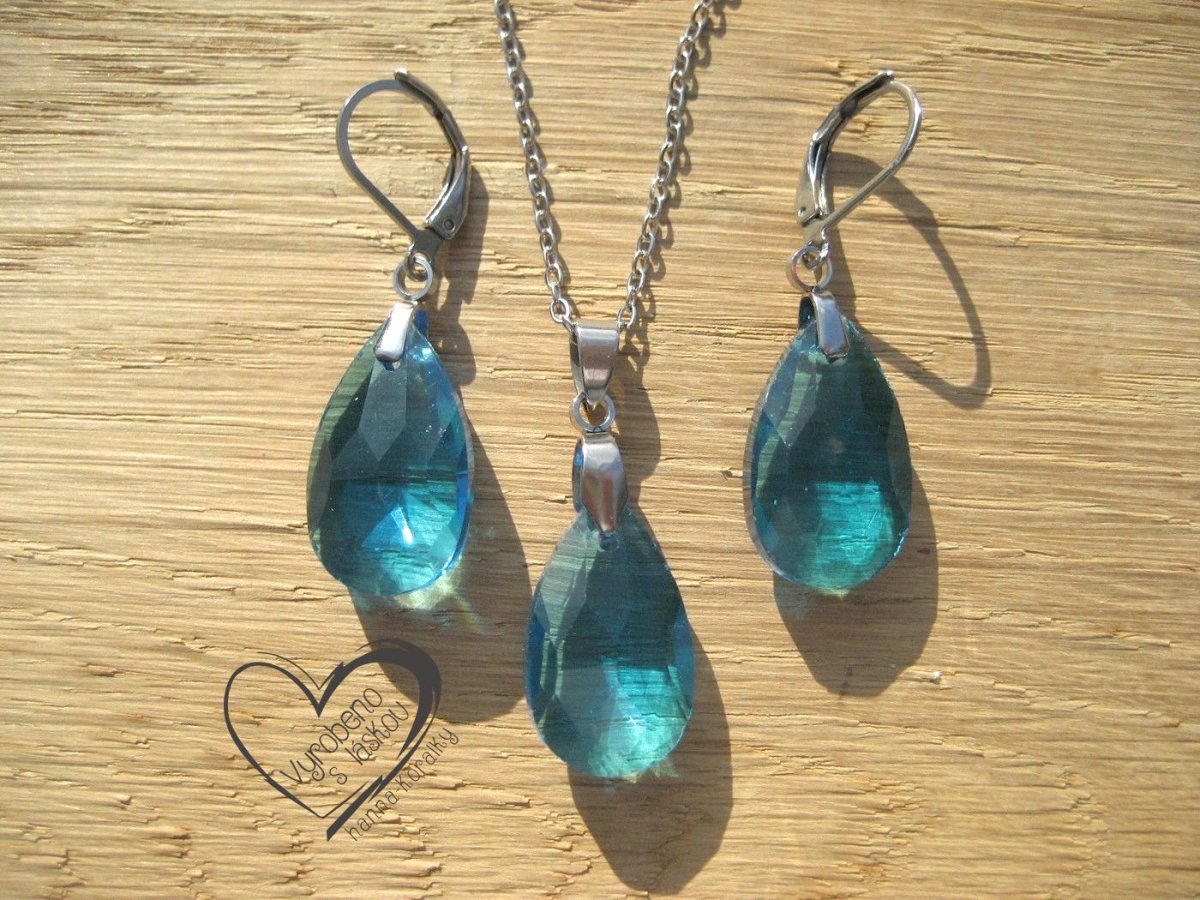 Jednoduchá a zároveň velmi elegantní sada z nerez oceli - řetízek 45cm a visací náušnice s uzavíratelným háčkem kapka 2,6x1,8 cm, přívěsky jsou z broušeného skla v tyrkysové čiré barvě, součástí sady je dárková krabička