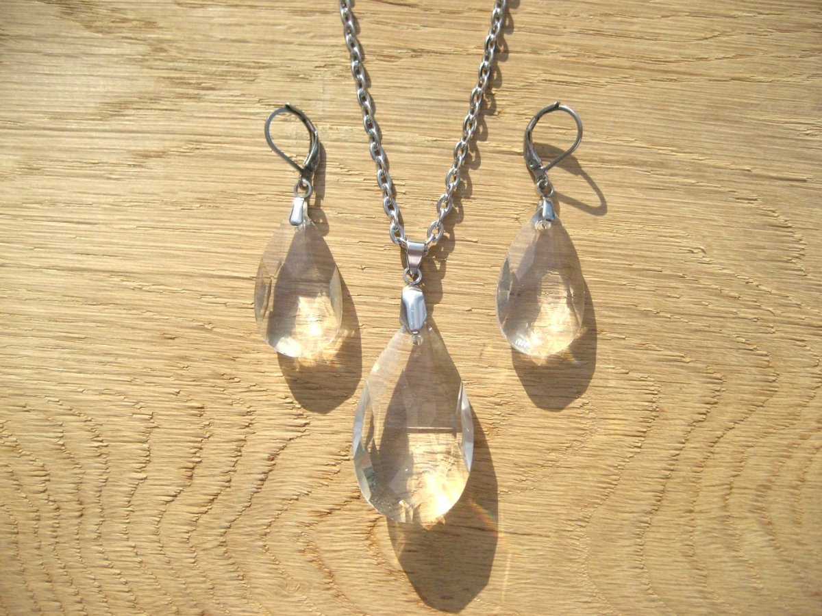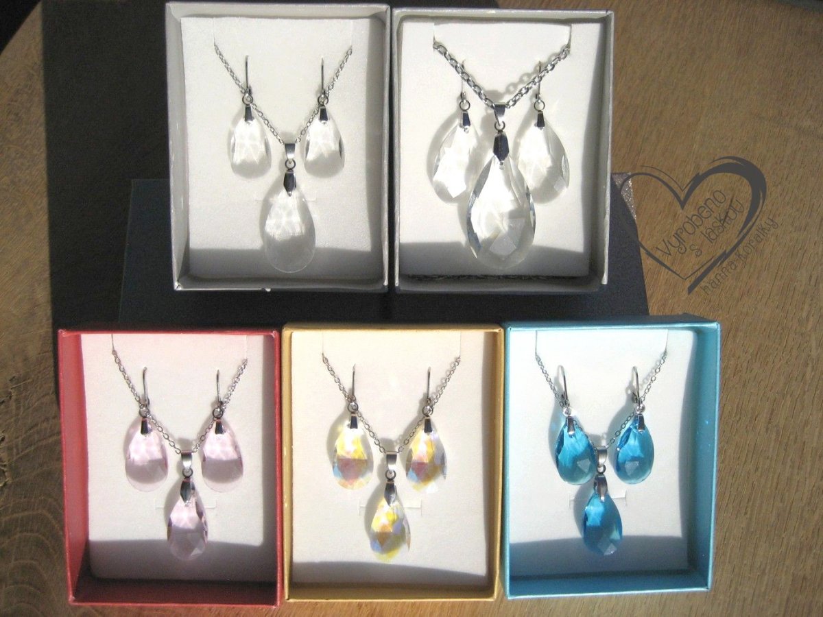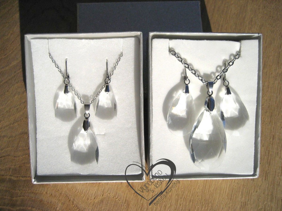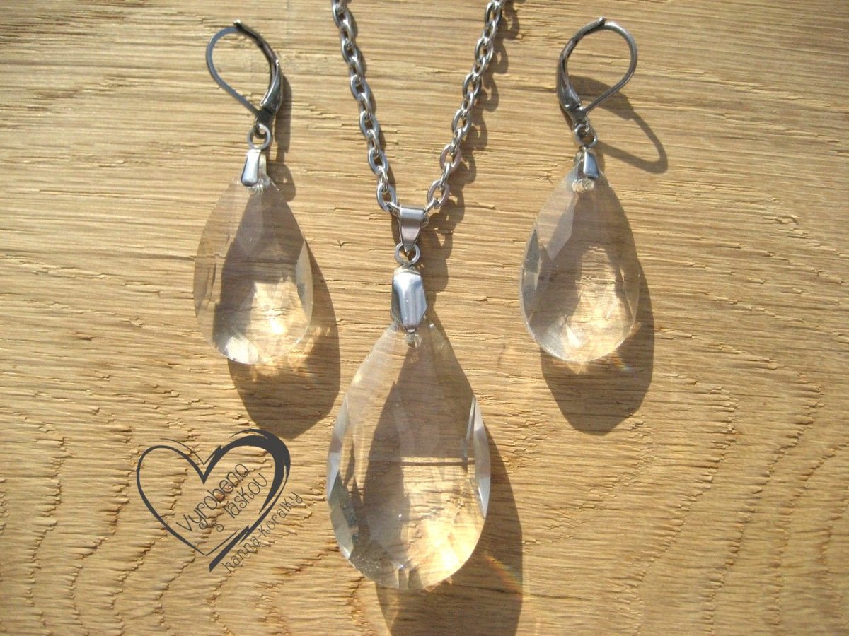 Elegantní, jednoduchá a zároveň výrazná sada z nerez oceli - pevný řetízek 55cm s velkým přívěskem 5x2,3 cm a visací náušnice s uzavíratelným háčkem a kapkou 3,3x1,7 cm, přívěsky jsou z broušeného skla v bílé čiré barvě, součástí sady je dárková krabička