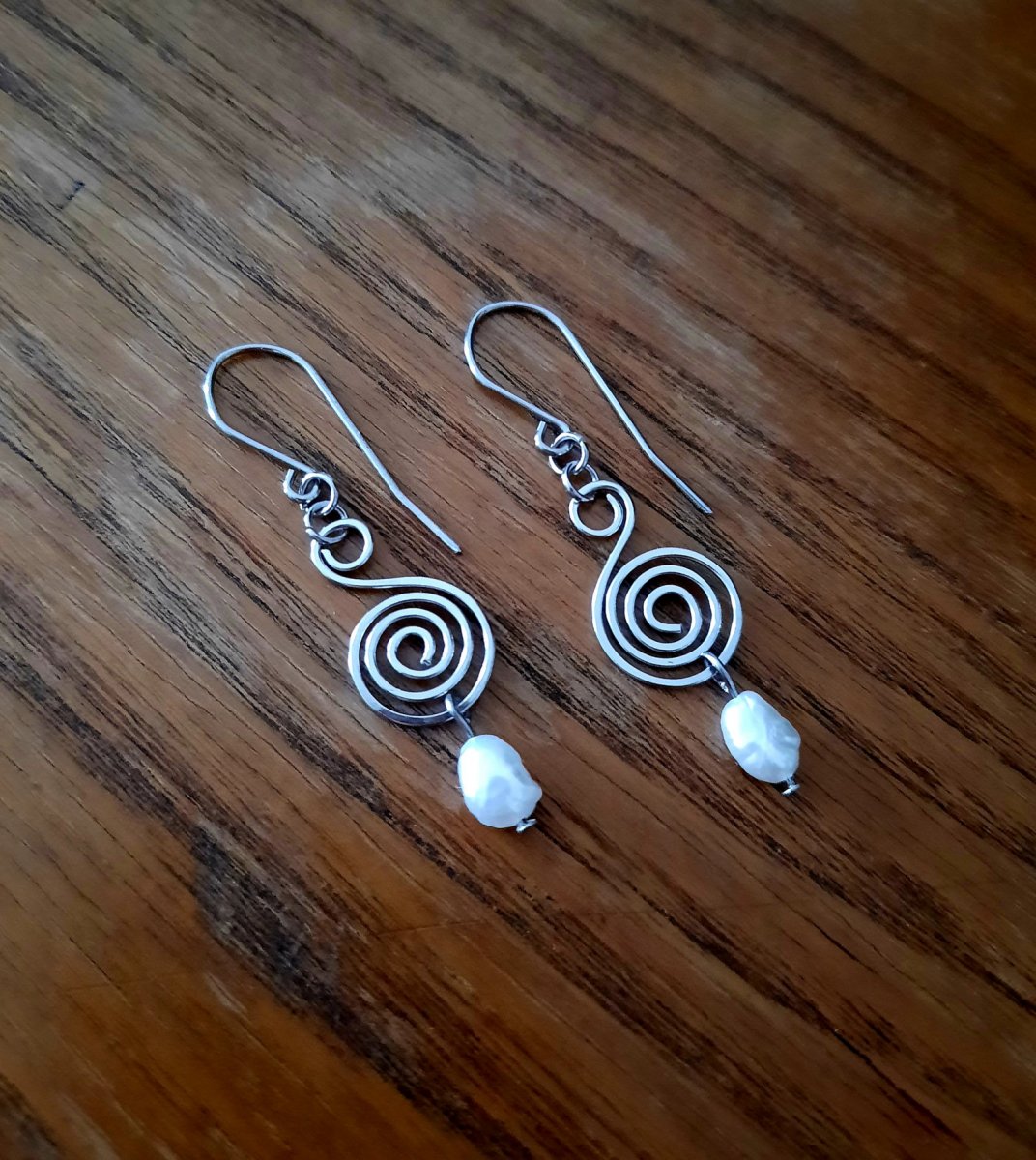 Náušnice s krásnými bílými říčními perlami jsou ručně tepané z leštěné chirurgické oceli .
