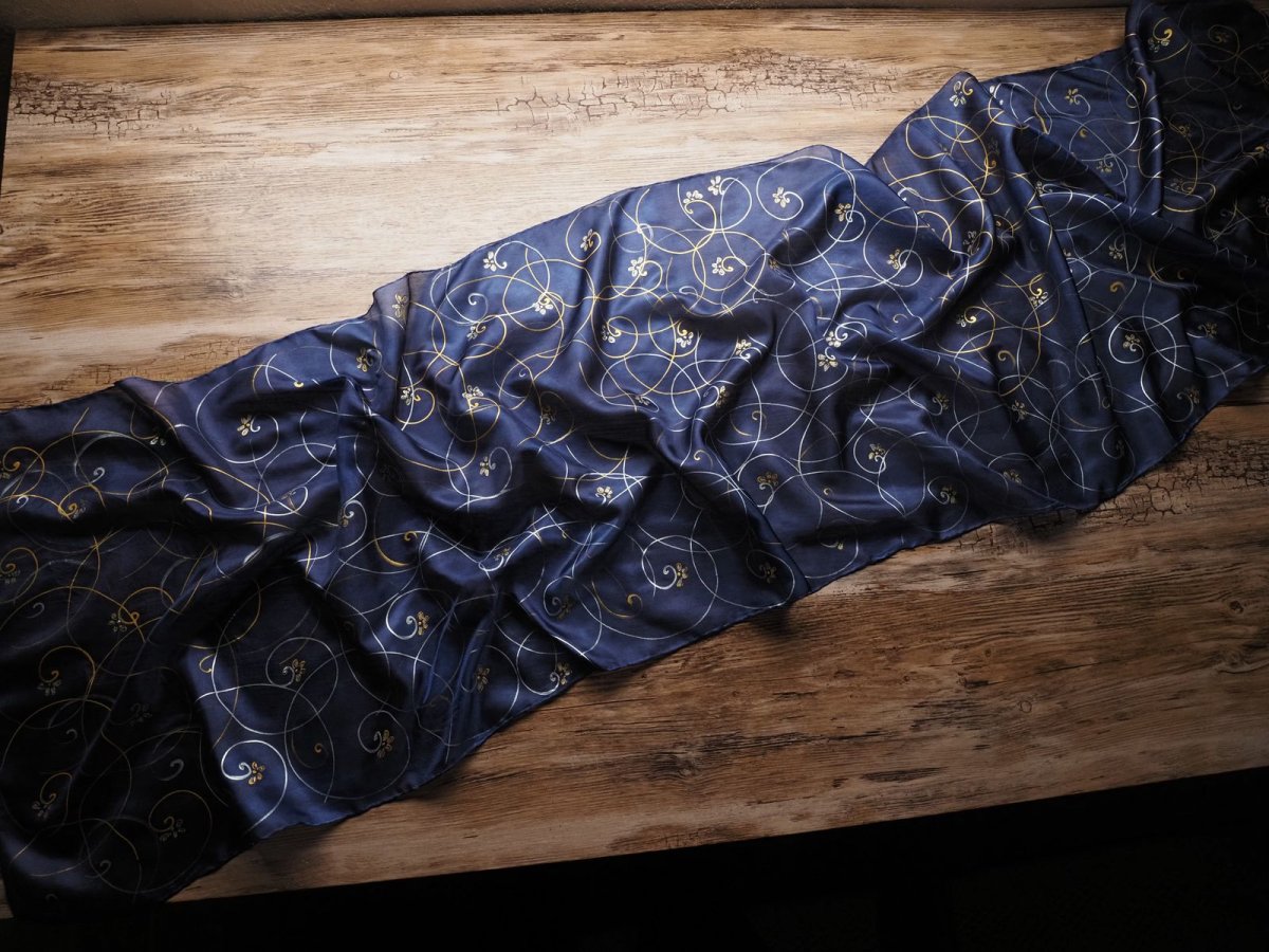 Ručně malovaný šál z přírodního hedvábí (pongé 5). Použití kvalitních barev a tepelné fixace zaručuje dlouhodobou odolnost při opakovaném praní. Snadno se žehlí.