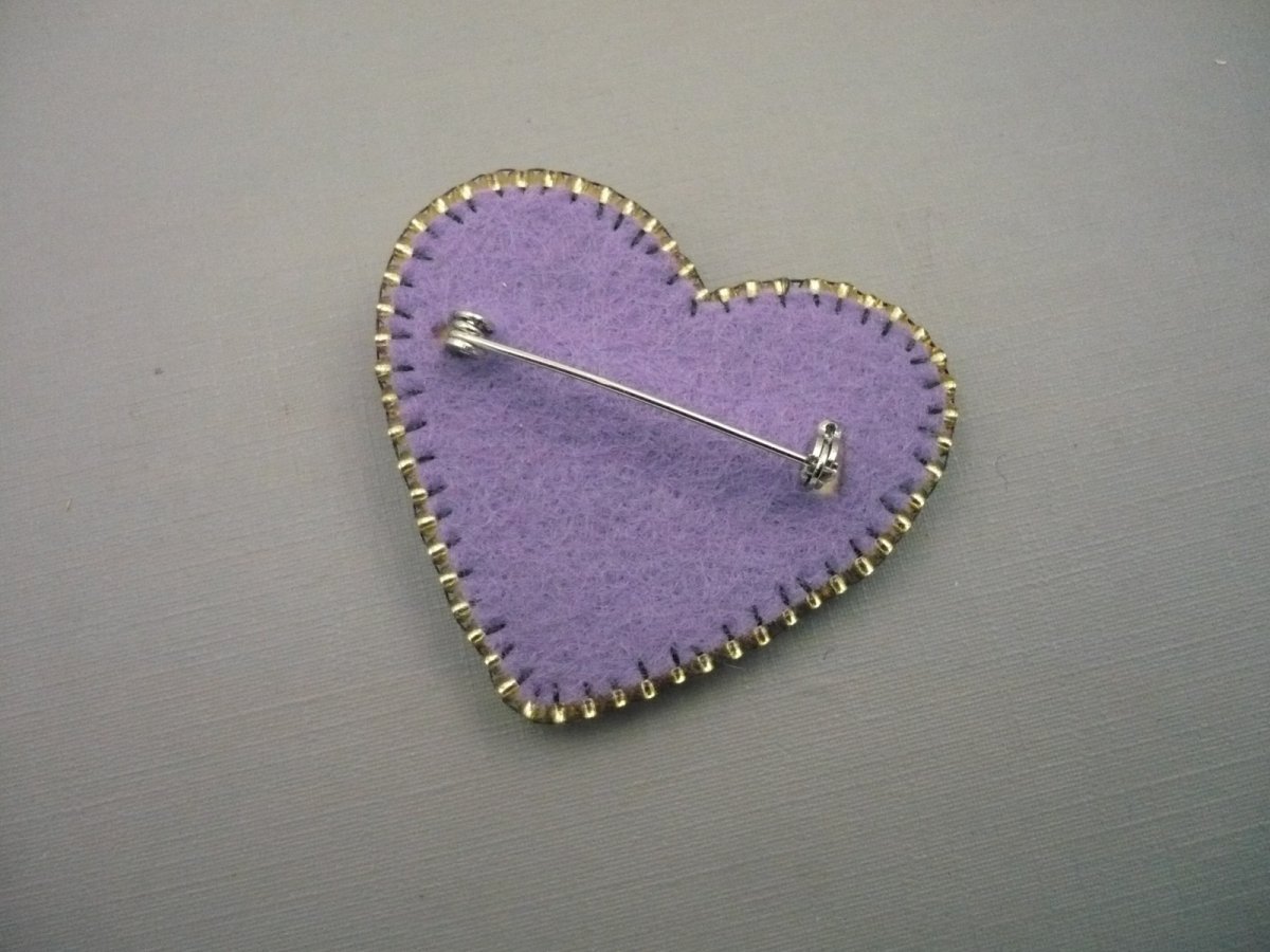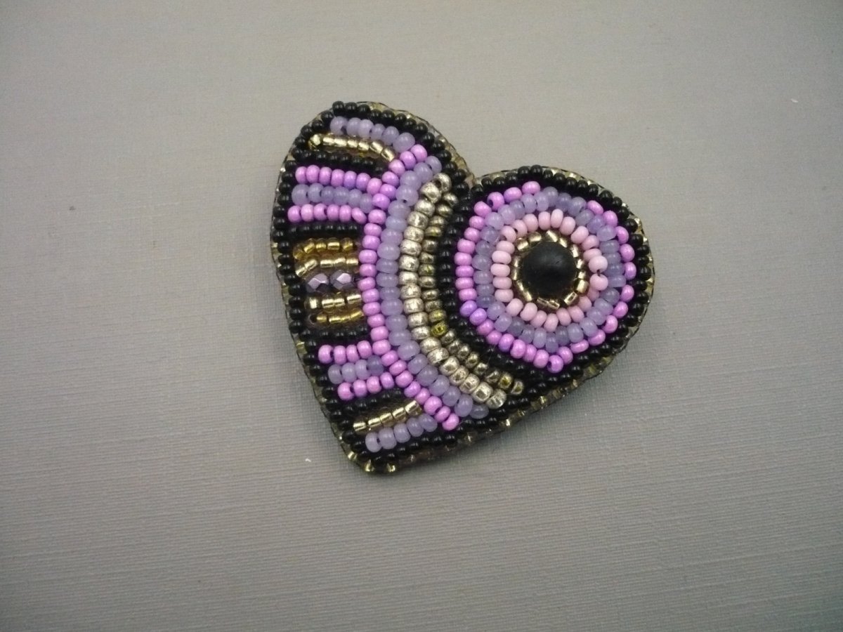 Ručně vyšívaná brož technikou beadweaving. Je pošita rokajlem, vše je podloženo fialovou plstí, na zadní straně je brožový špendlík s pojistkou. Rozměry 49 x 43 mm.