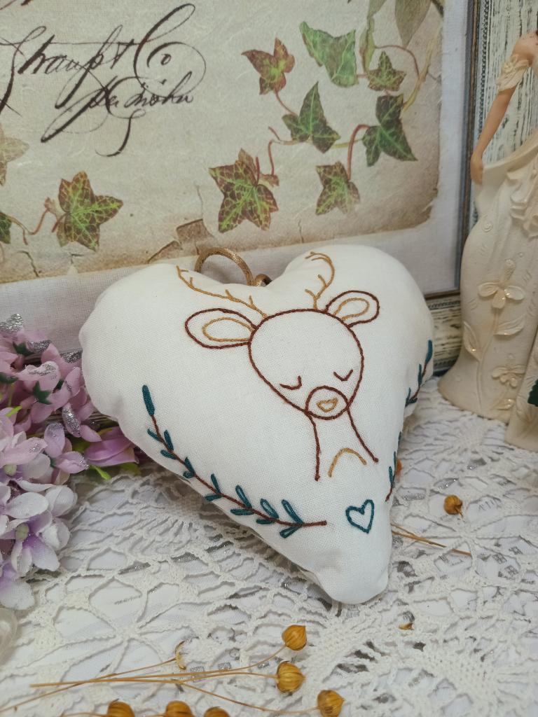 Ručně vyšívané srdíčko s motivem srnečka ve chojí a pruhů na zadní straně. Srdíčko je plněné dutým vláknem a sáčkem s levandulí (lékařské kvality). Srdce je vhodné jako dárek, je možné ho zavěsit, přidat do dekorací, do věnce, nebo jen tak volně položené, také je možné zavěsit na postýlku, pro lepší spánek a zklidnění.