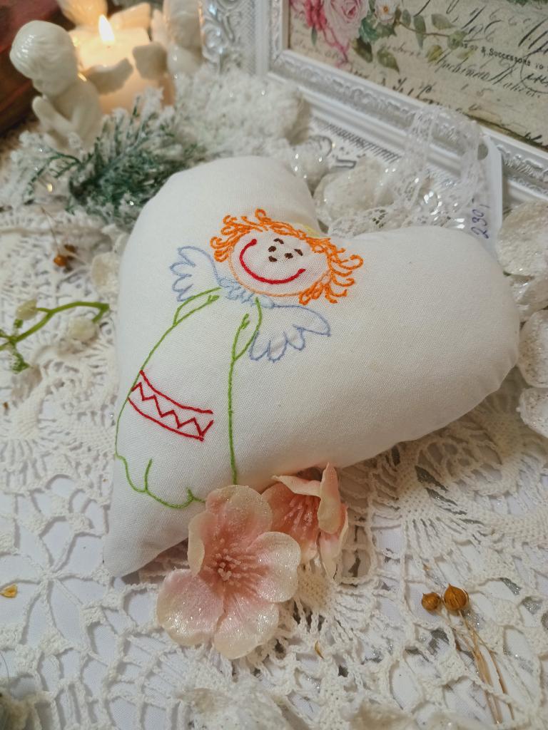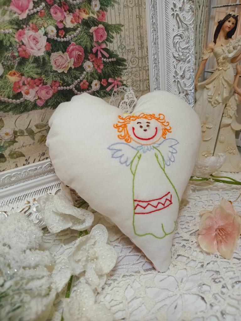 Ručně vyšívané bavlněné srdíčko s motivem šťastného andílka a z druhé strany tištěnými andílky. Srdíčko je plněné dutým vláknem a sáčky s levandulí, je opatřené krajkou k zavěšení. Vhodné např.: na okenní kličku, do okna, na skříňku, do dekorací, nebo do věnce, aj..