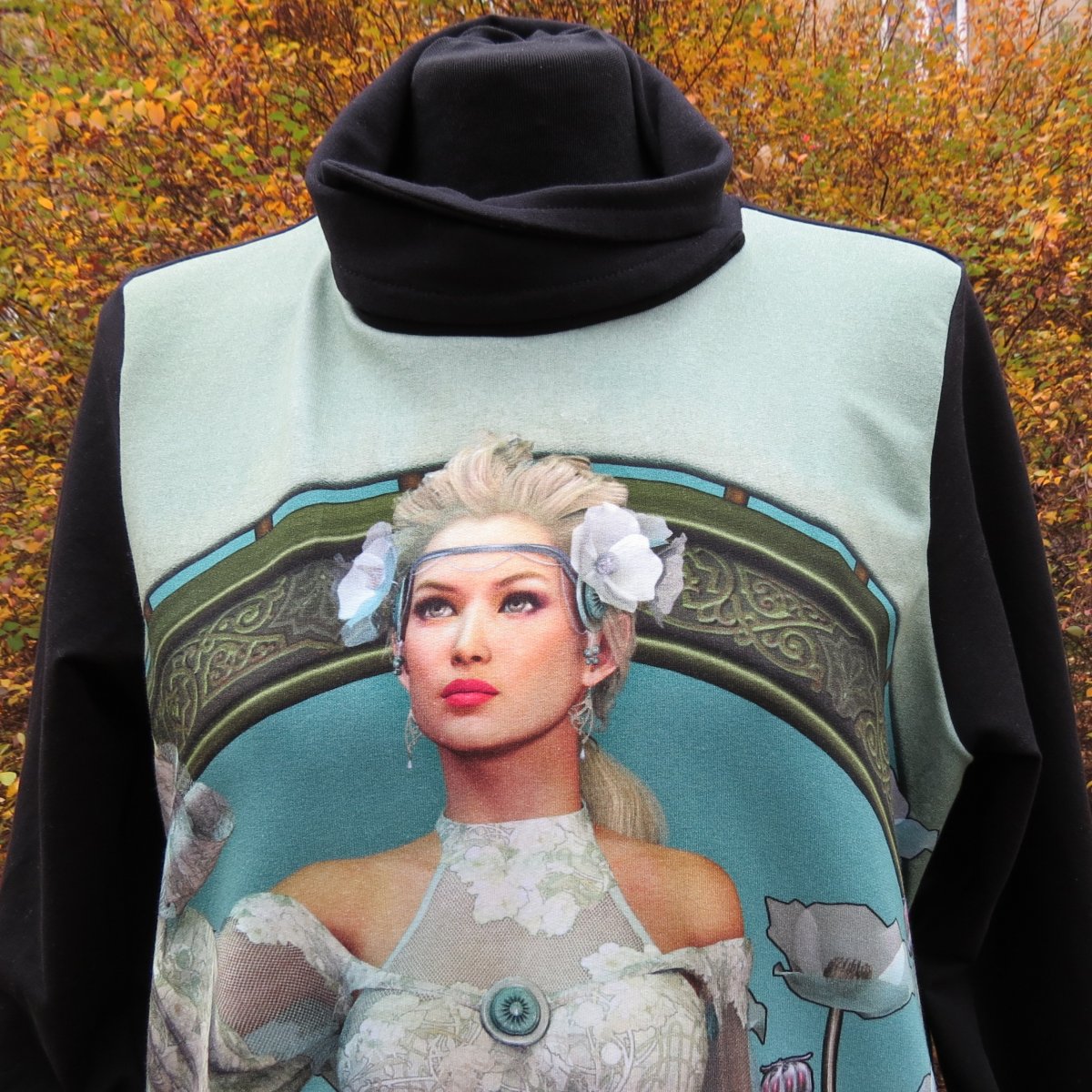 Mikinošaty v kombinaci dvou látek - pření díl je z látky s motivem ženy v bílém, záda a rukávy jsou černé. U krku jsou zakončené překříženým stojáčkem. V bočních švech mají kapsy. Jsou ušité z nepočesané bavlněné teplákoviny s elastanem.