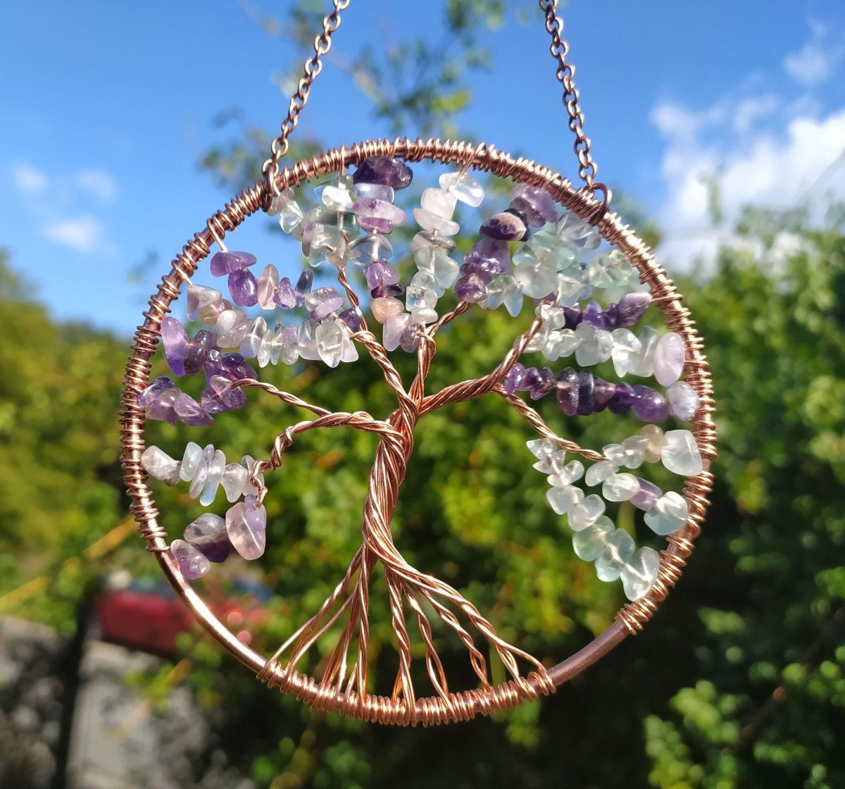Dekorace k zavěšení. Je vyrobena z drátku měděné barvy a úlomků minerálu fluoritu.