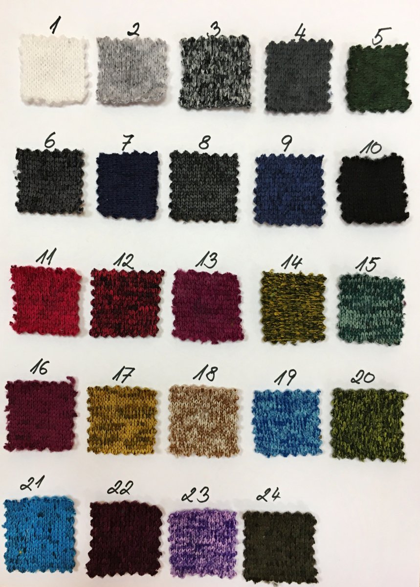 Barva 1-bílá,2-světle šedý melír,3-černo-bílý melír,4-šedý antracit,5-tmavě zelená,6-šedo-černý melír,7-tmavě modrá,8-černo-šedý melír,9-středně modrá s černým melírem,10-černá,11-malinová,12-červeno-černý melír,13-ostružina jasná,14-hořčicovo-černá,15-zelený melír,16-ostružina,17-hořčičná,18-bežová,19-světlý tyrkys,20-olivově-černý melír,21-tyrkysová,22-tmavě fialová(lilková),23-světle fialová,24-hnědá.