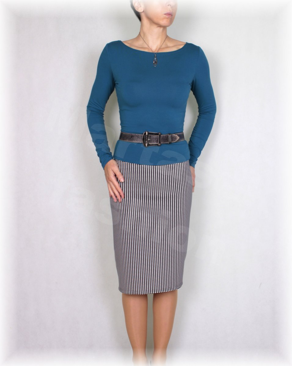 Sukně ze silnějšího úpletu, přitom krásně poddajný, nemačkavý a na tělo úžasně příjemný materiál.Decentní vzor,drobné čtverečky.Dobře se kombinuje se všemi barvami. Nafocené trikovz.530 najdete v různých barvách také v obchůdku . Sukně jde využít celoročně. Mohu ušít klasickou do pasu nebo bokovou, do A nebo rovnou. Napište s mírami do objednávky. Do všech sukní je možno přidat tenkou elastickou podšívku,připište do objednávky. Částka na materiál elastické podšívky u sukně v délce ke kolenům je 100kč.