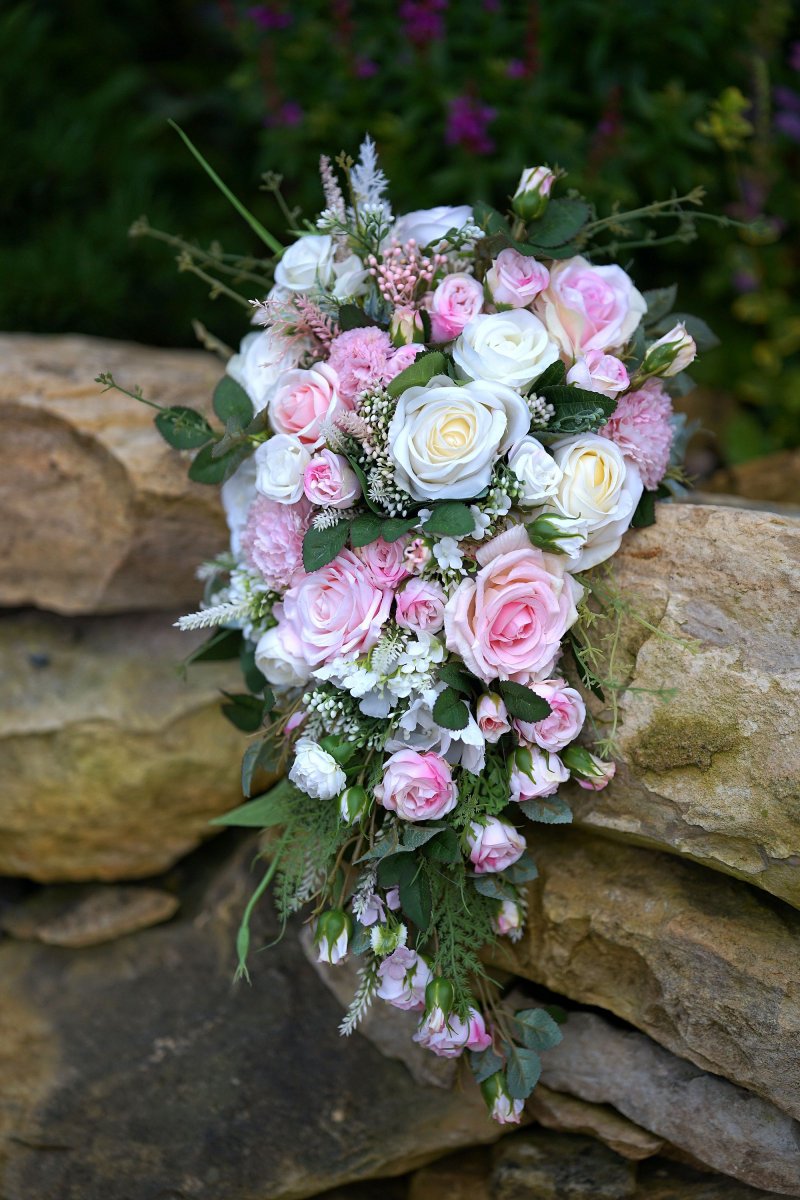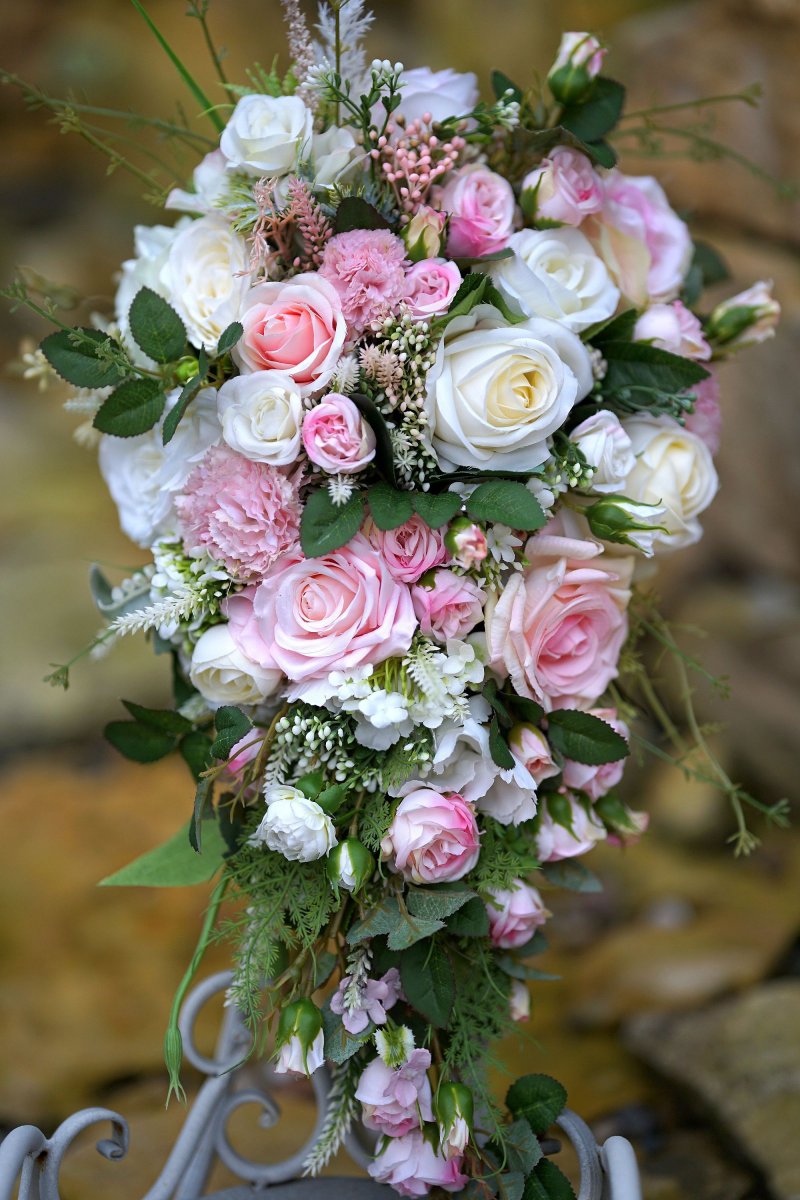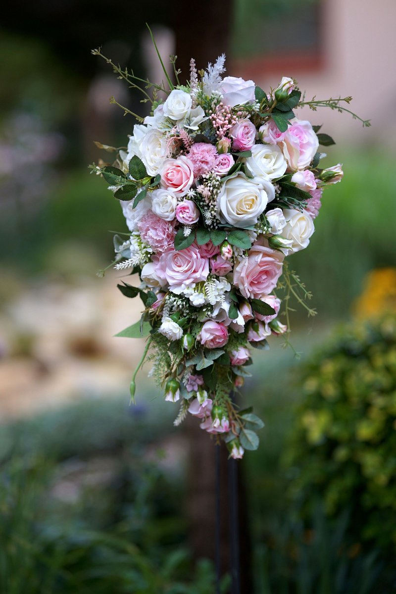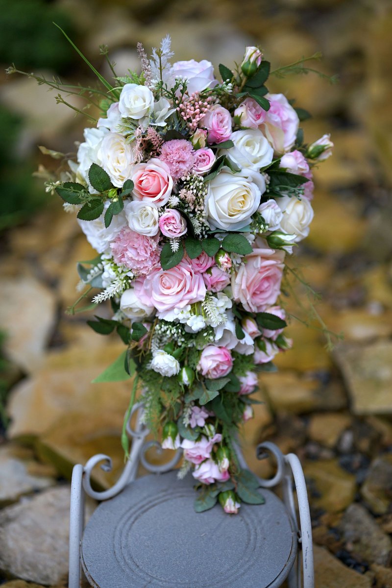 Svatební kytice z látkových květin. Styl převislý.