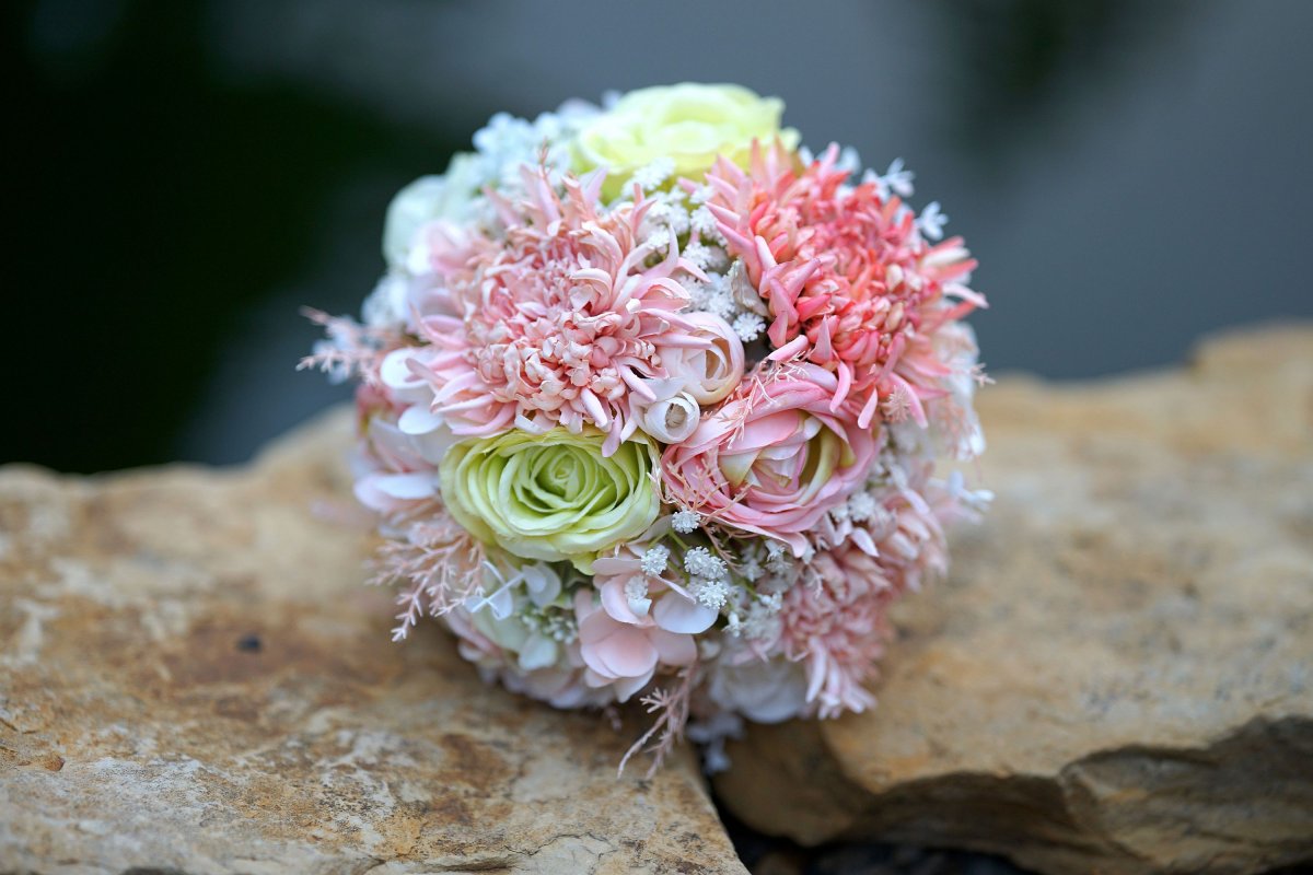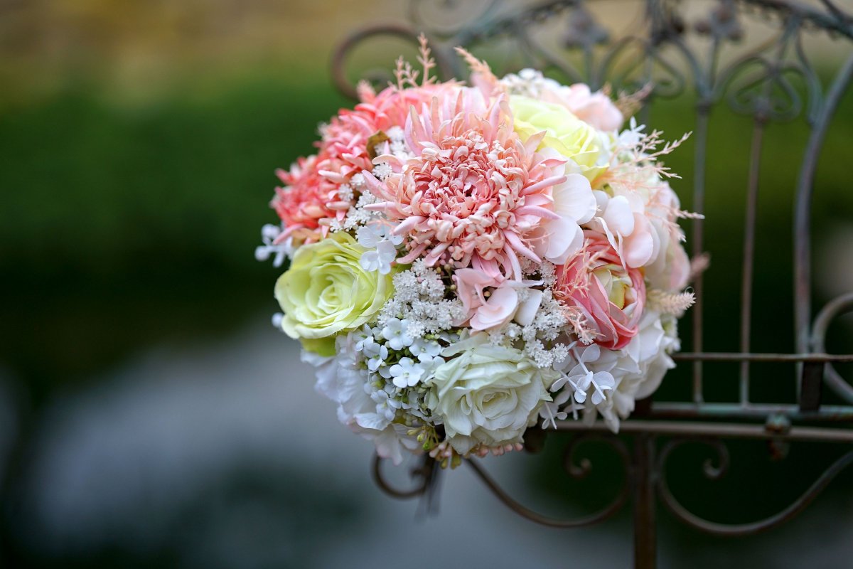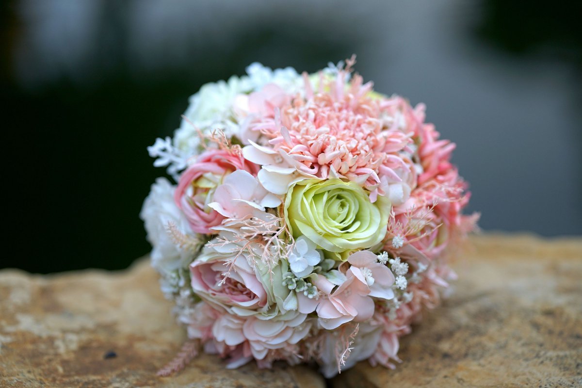 Kulatá svatební kytice v bílé, růžové a světle zelené barvě.