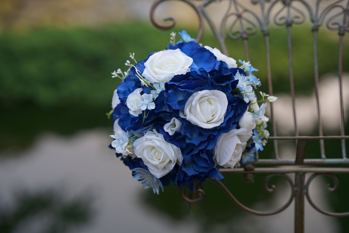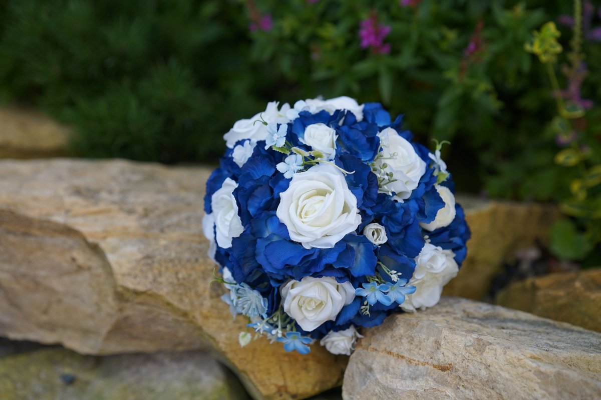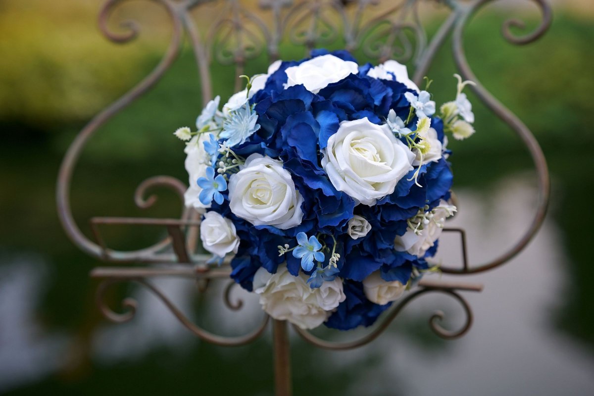 Svatební kytice z látkových květin v modré a bílé barvě.