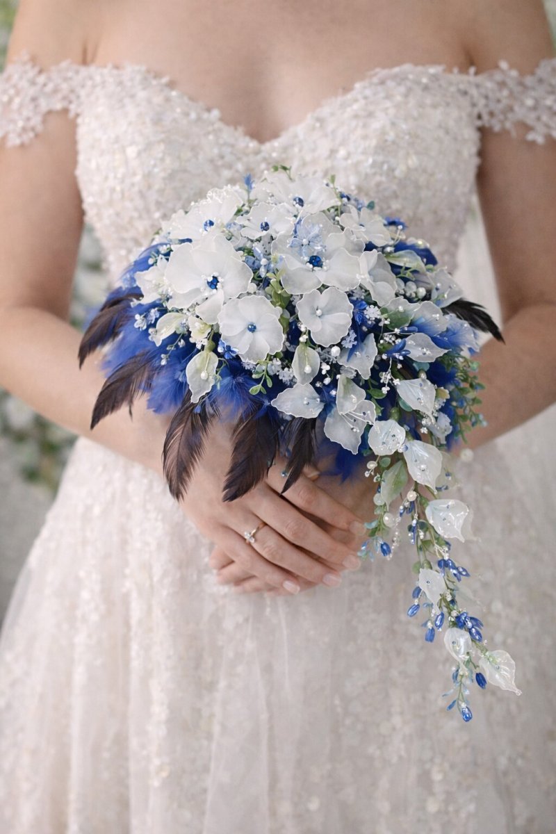 Jemná ručně vyráběná kytička pro družičku v modro-bílé barevné kombinaci je krásným a praktickým doplňkem pro svatební obřad. Nylonové květy doplněné tylovými detaily a drobnými korálky působí lehce, romanticky a dokonale ladí s šaty družiček.