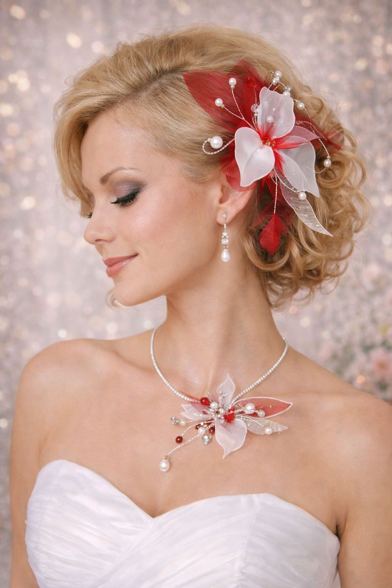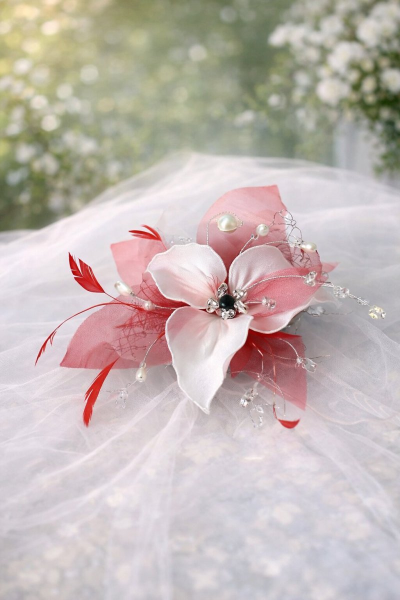Jemná ručně vyráběná vlasová ozdoba s červenobílím květem a perličkami je elegantním doplňkem pro svatební a slavnostní účesy. Průsvitné okvětní lístky v pudrově růžových tónech, doplněné drobnými perličkami a jemnými větvičkami, vytvářejí romantický a velmi ženský vzhled.