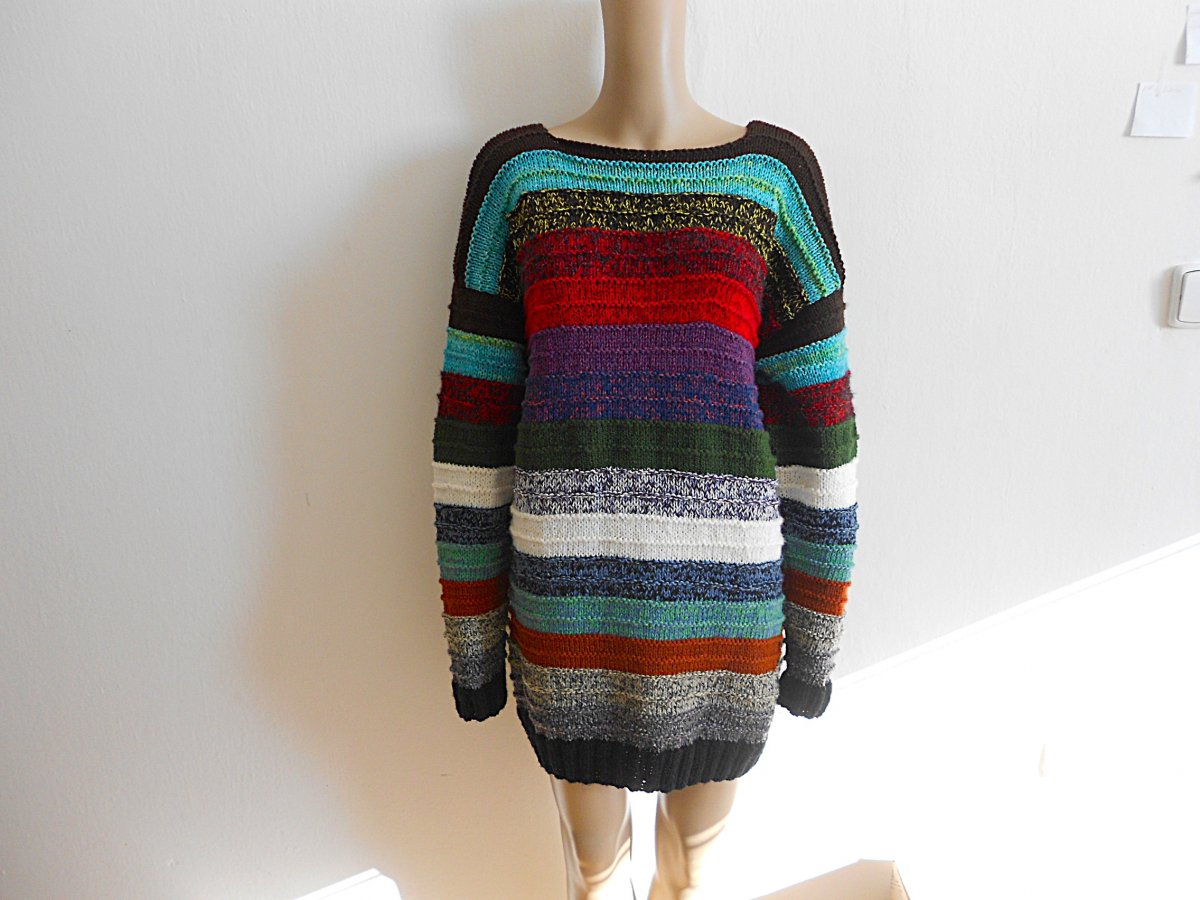 Dámský, dlouhý ručně pletený, teplý svetr, velikost L,XL: délka 72cm, šířka 51 cm, vnitřní délka rukávu 52 cm. Doporučuji jemné praní a sušit volně položené.