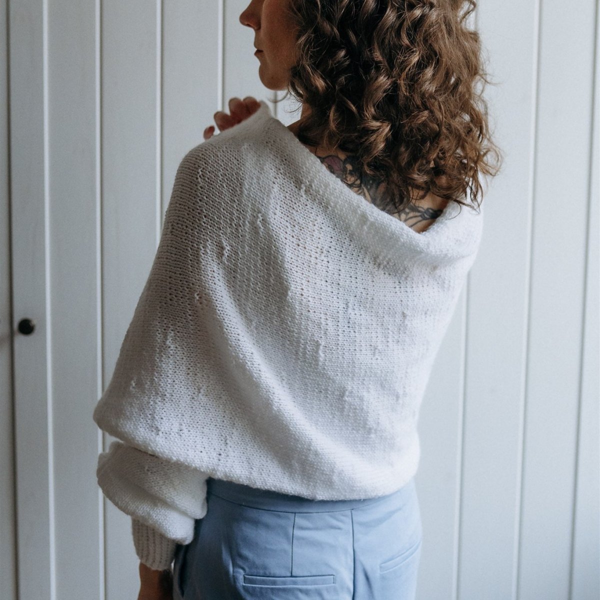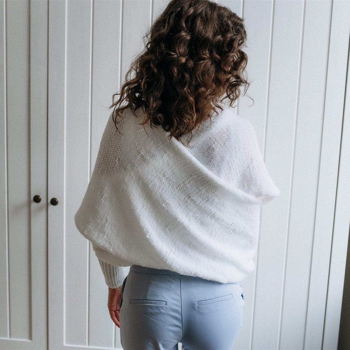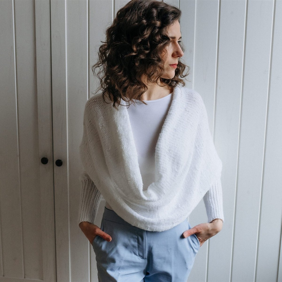 Tento svetr - pléd je spojením dvou výrobků. Elegantního plédu a teplého svetru. Jeho předností je oblékání bez nutnosti přetahovat svetr přes hlavu, jednoduše navléknete rukáv, pléd omotáte kolem těla a navléknete rukáv druhý.Lze nosit s překřížením vpředu i vzadu. Je vyroben z lehoučké akrylové příze a díky jemnému vzorku jej můžete použit jako doplněk ke svatebním šatům a po obřadu využit na běžné nošení.