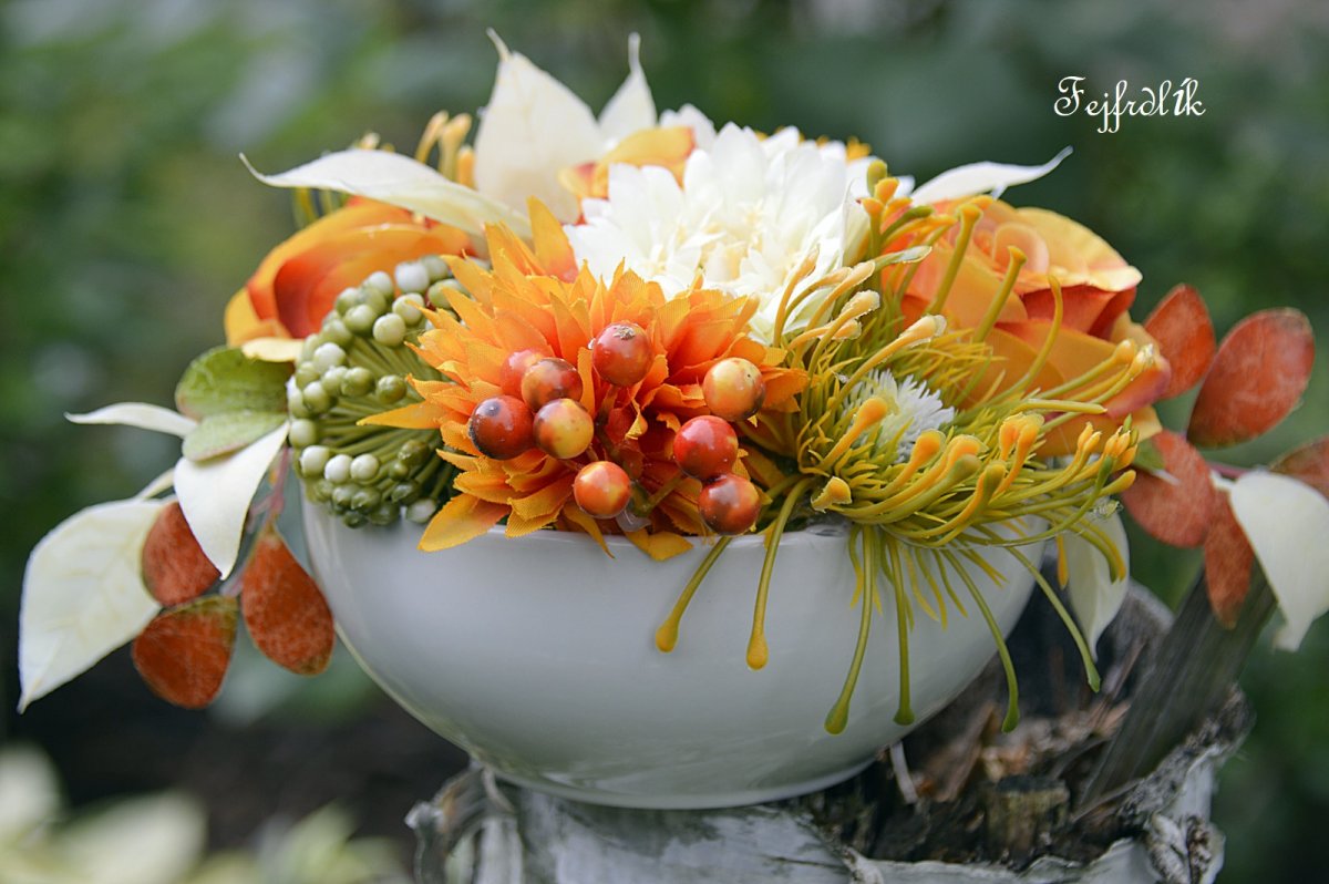 Aranžmá v porcelánové misce, kde jsou umělé květiny, bobule a přízdoby .