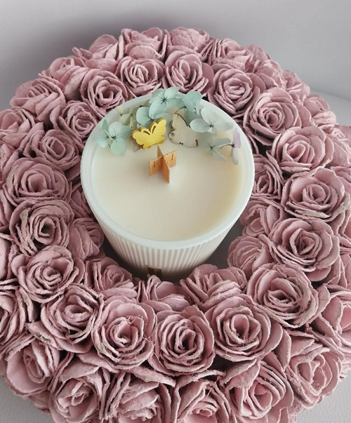 Svíčka v bílé skleněné doze, zdobená sušenými květy a motýlky ze dřeva.