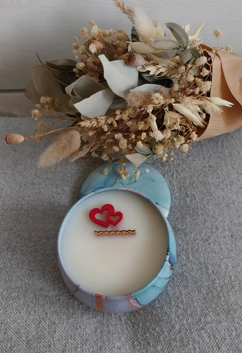 Svíčka v hliníkovém obalu, s ukrytým textem "Děkuji". Slovo děkuji je ukryto pod voskem. Při zapálení svíčky a roztátí vosku se ukáže darovanému text, který určitě potěší. Zdobené srdíčkem.