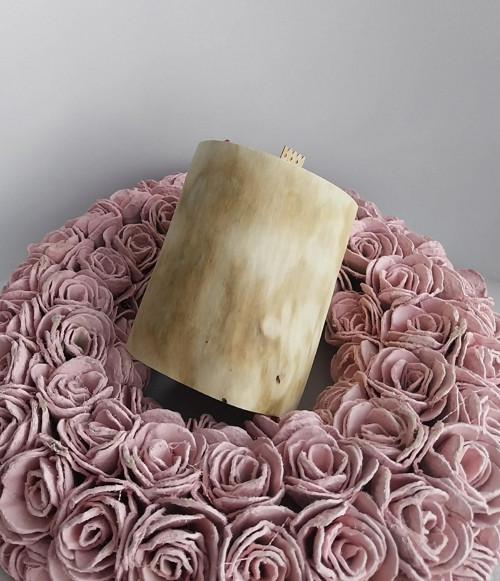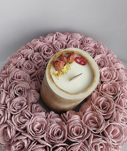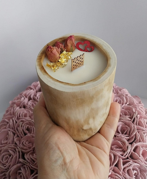 Svíčka ve dřevě. Spojení přírody s krásnou svíčkou, nádhera. Zdobená plátky zlata a sušenými růžemi.