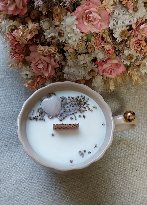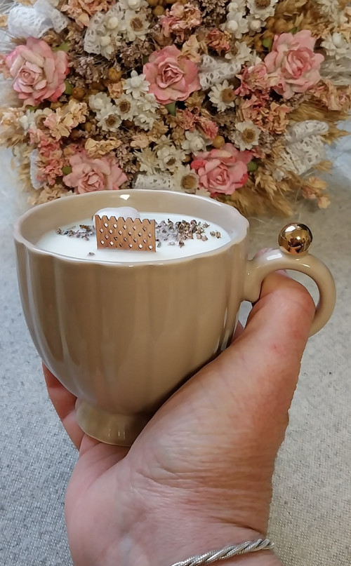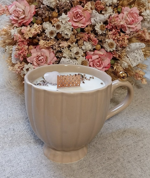 Svíčka v keramickém hrníčku, ktery jde použít po vyhoření jako hrníček na kávičku. Elegantní a krásný hrníček. Svíčka zdobená sušeným vřesem a srdcem z růženínu.