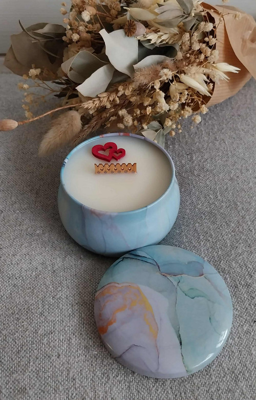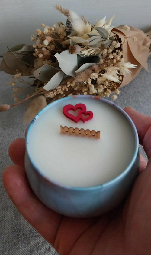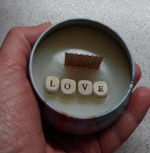 Svíčka v hliníkovém obalu, s ukrytým textem "Love". Slovo love je ukryto pod voskem. Při zapálení svíčky a roztátí vosku se ukáže darovanému text, který určitě potěší. Zdobené srdíčkem.