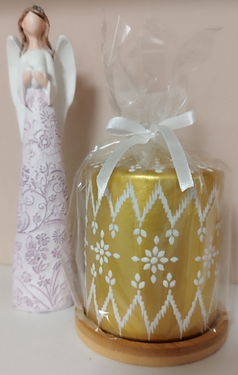 Ručnš zdobená svíčka ve tvaru válce, zdobeno horkým voskem. Svíčka kvalitní, od českého výrobce, možno zapálit, nestéká.
