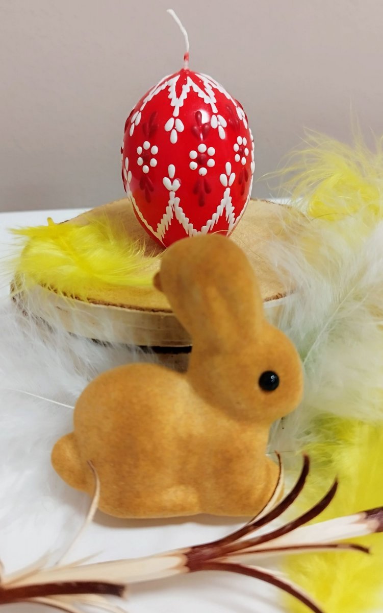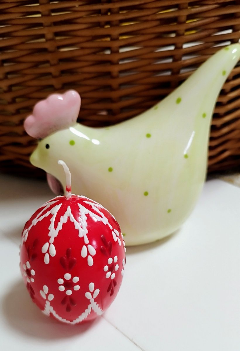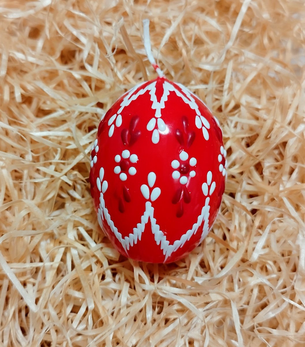 Svíčka kraslice, ručně zdobená horkým voskem, stejnou metodou, jako se zdobí klasické kraslice.