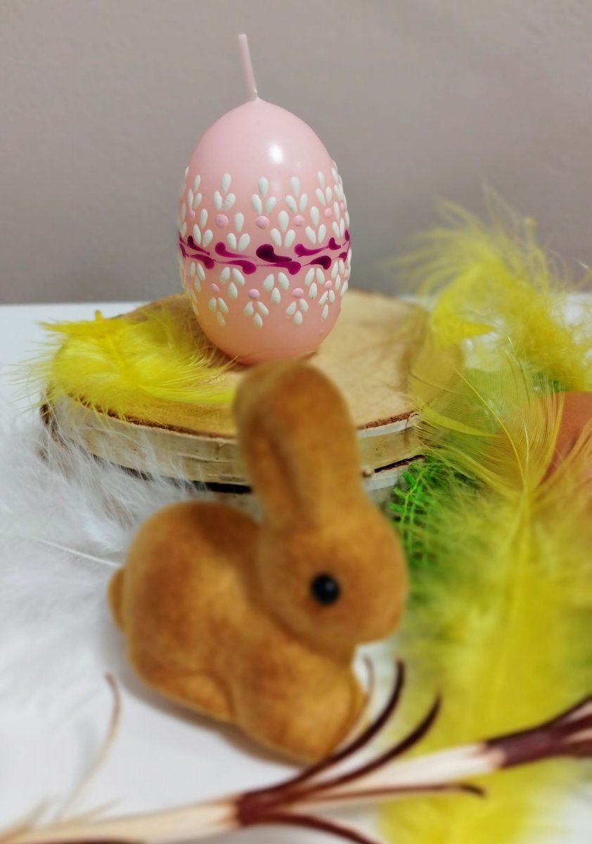 Svíčka kraslice, ručně zdobená horkým voskem, stejnou metodou, jako se zdobí klasické kraslice.