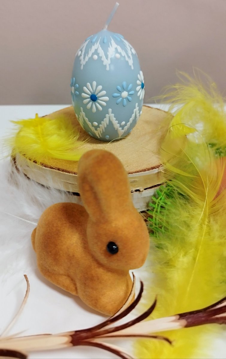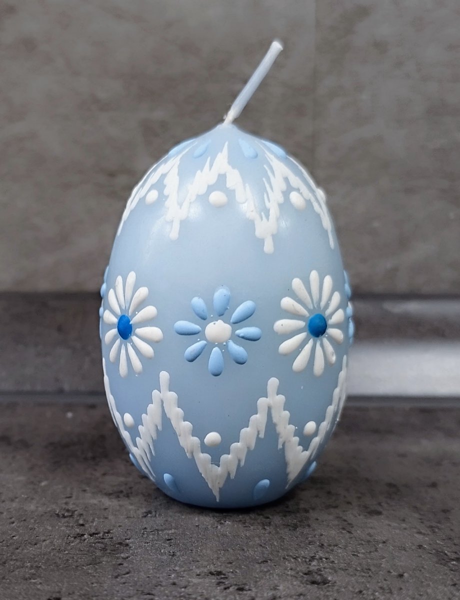 Svíčka kraslice, ručně zdobená horkým voskem, stejnou metodou, jako se zdobí klasické kraslice.