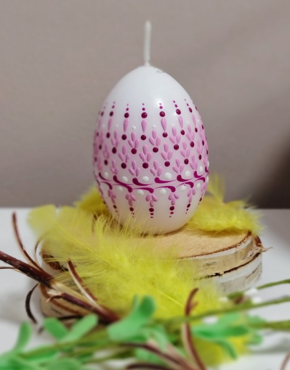 Svíčka kraslice, ručně zdobená horkým voskem, stejnou metodou, jako se zdobí klasické kraslice.