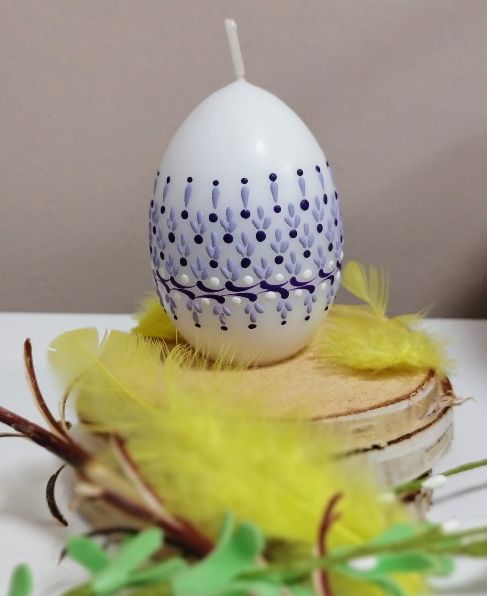 Svíčka kraslice, ručně zdobená horkým voskem, stejnou metodou, jako se zdobí klasické kraslice.