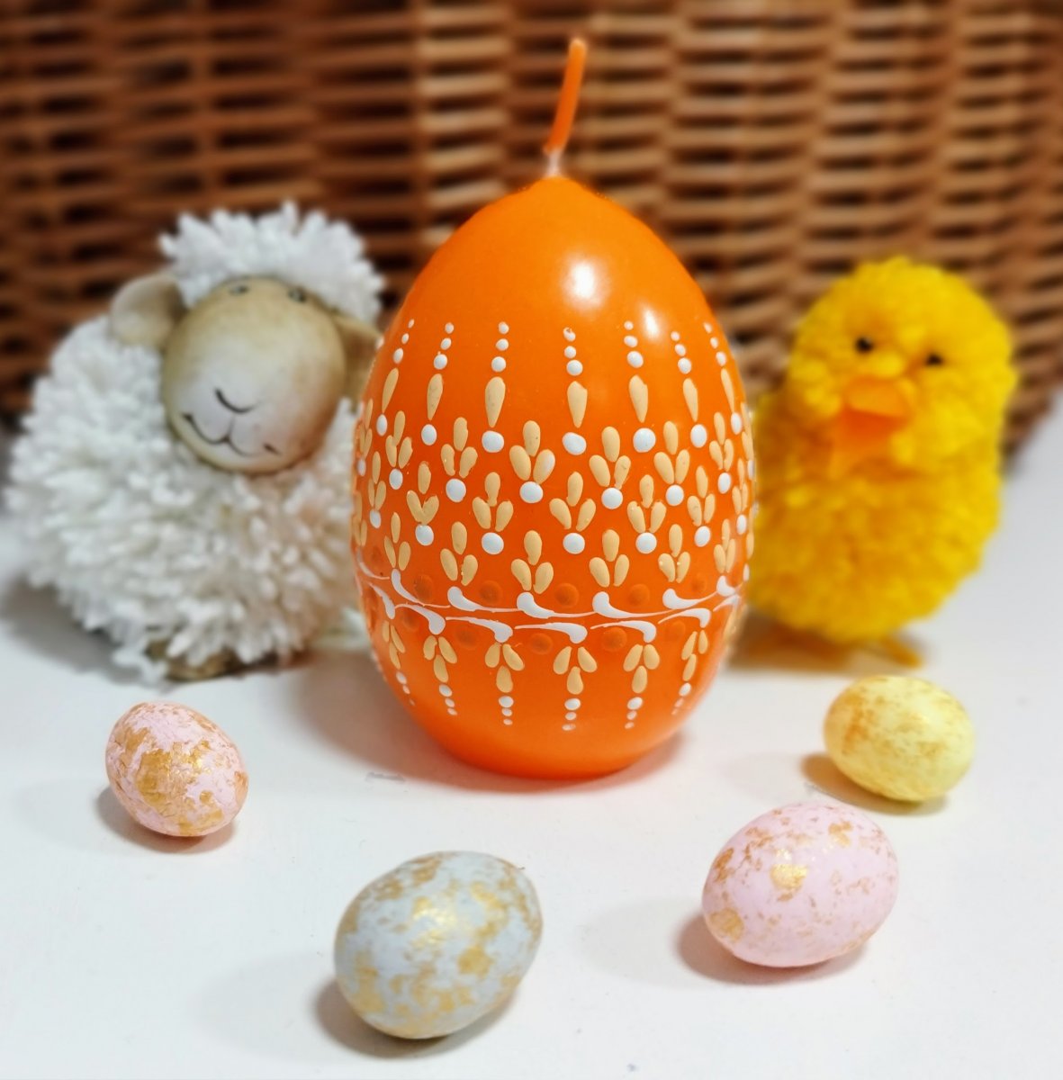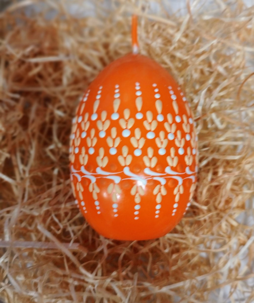 Svíčka kraslice, ručně zdobená horkým voskem, stejnou metodou, jako se zdobí klasické kraslice.