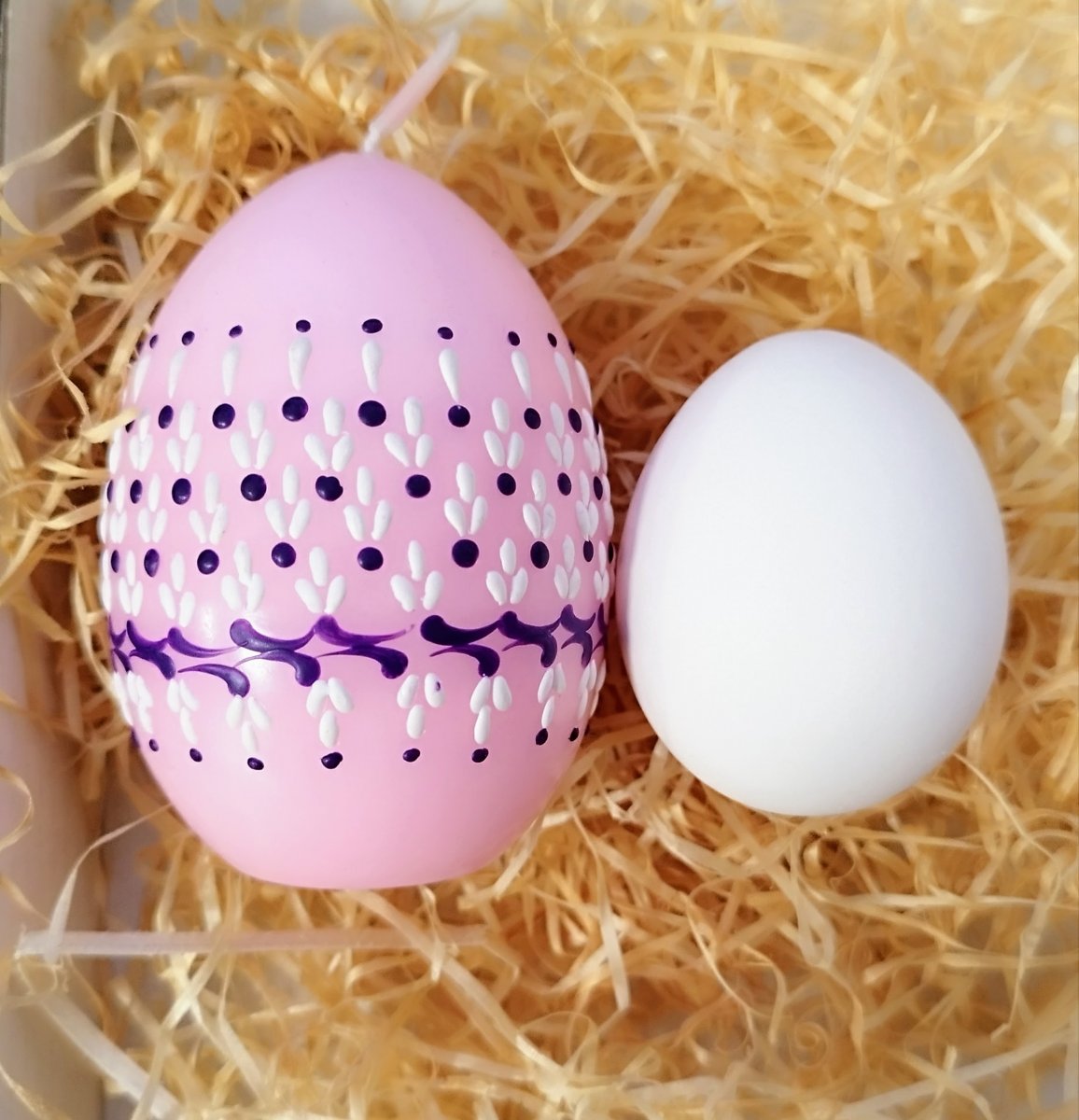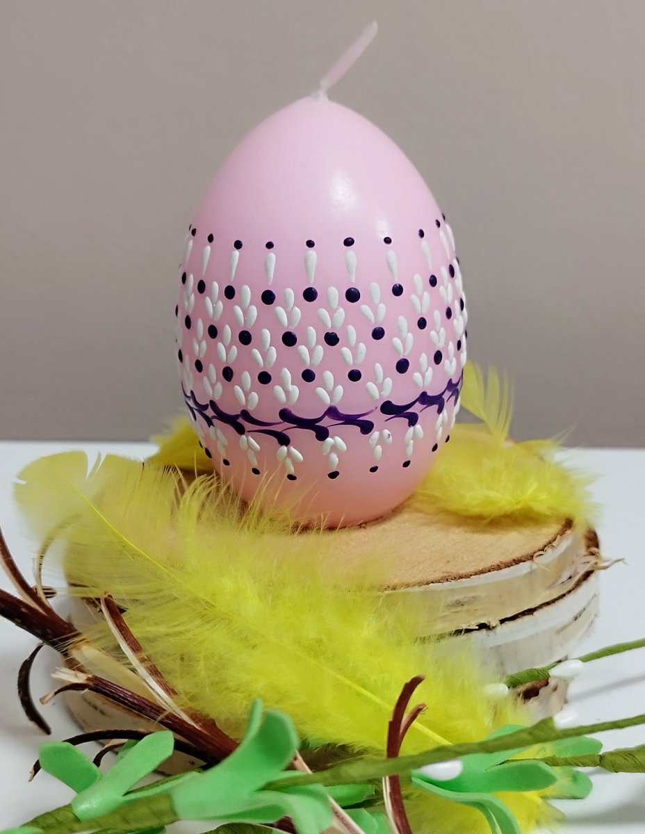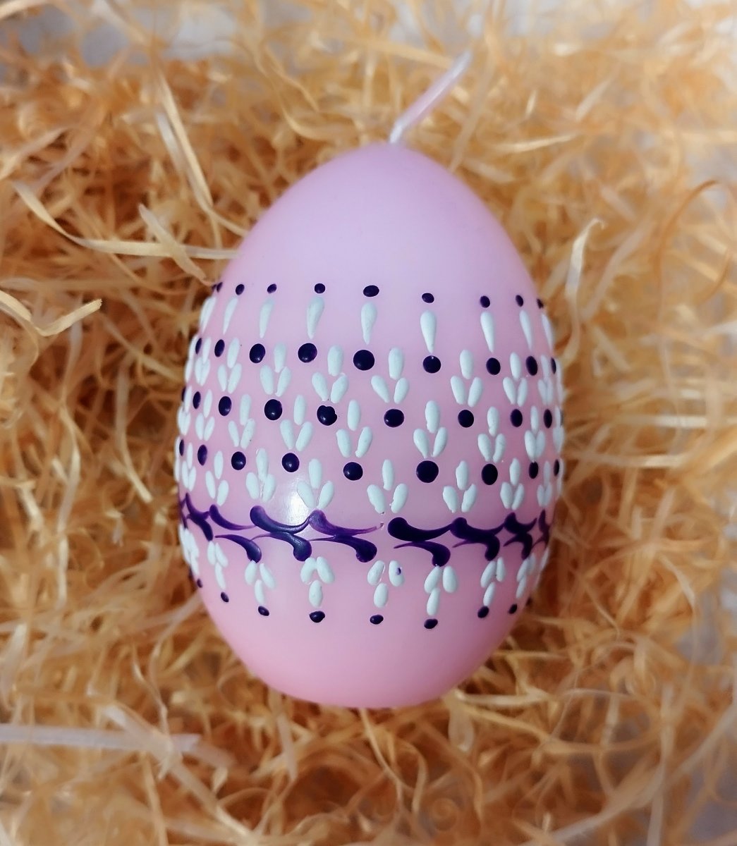 Svíčka kraslice, ručně zdobená horkým voskem, stejnou metodou, jako se zdobí klasické kraslice.