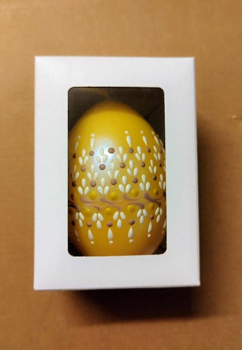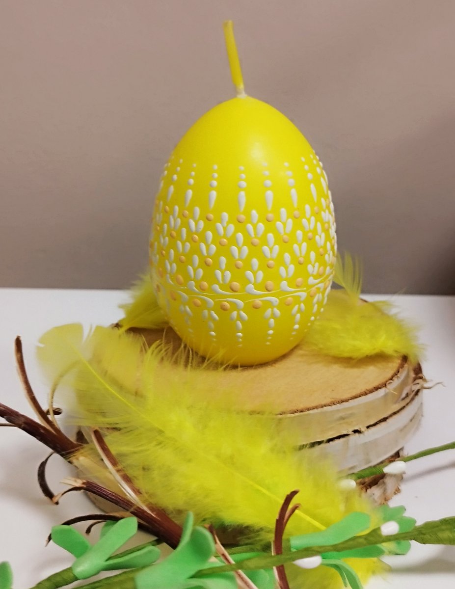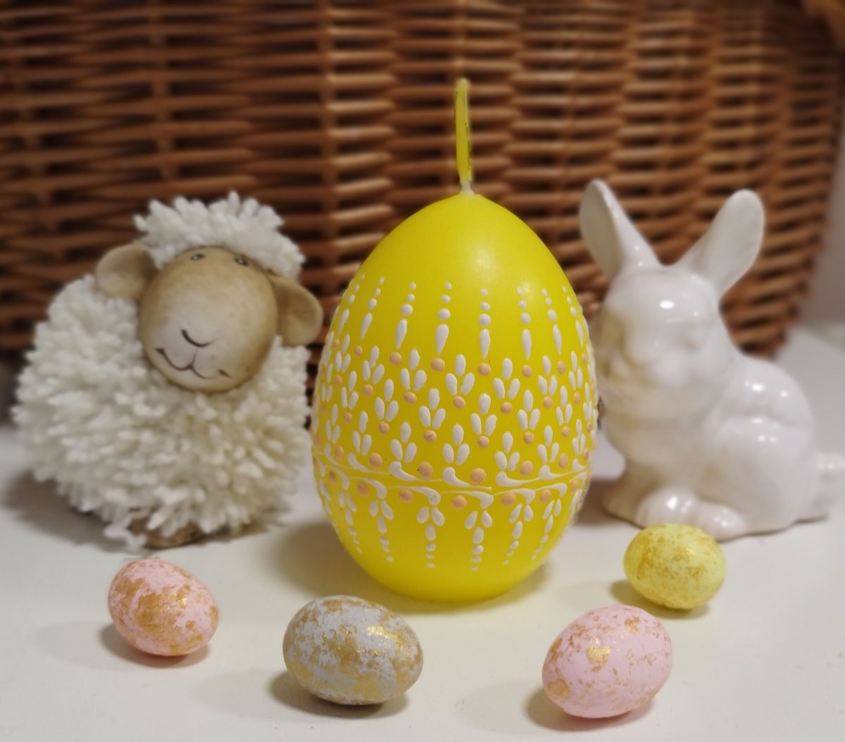 Svíčka kraslice, ručně zdobená horkým voskem, stejnou metodou, jako se zdobí klasické kraslice.