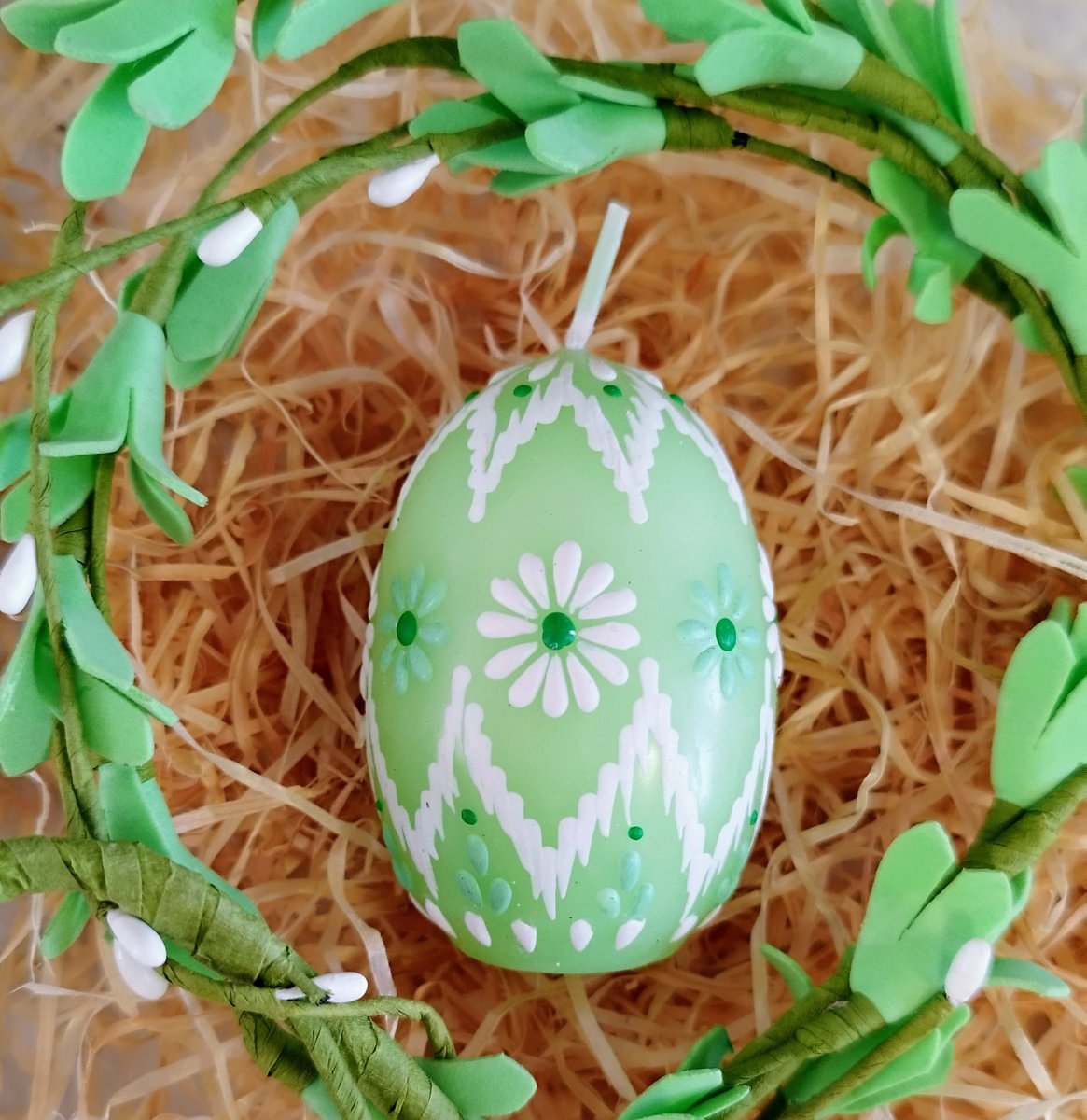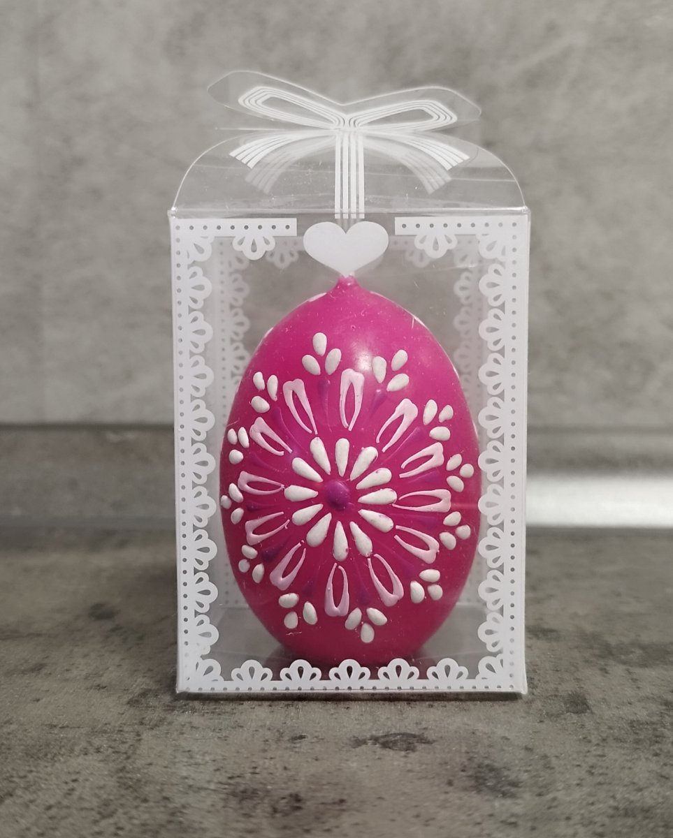 Svíčka kraslice, ručně zdobená horkým voskem, stejnou metodou, jako se zdobí klasické kraslice.