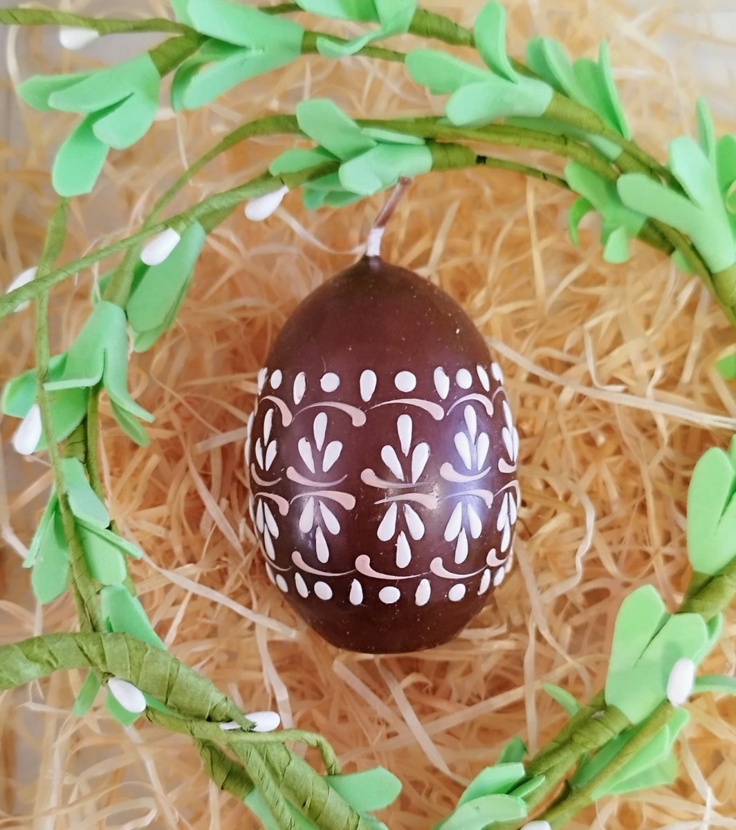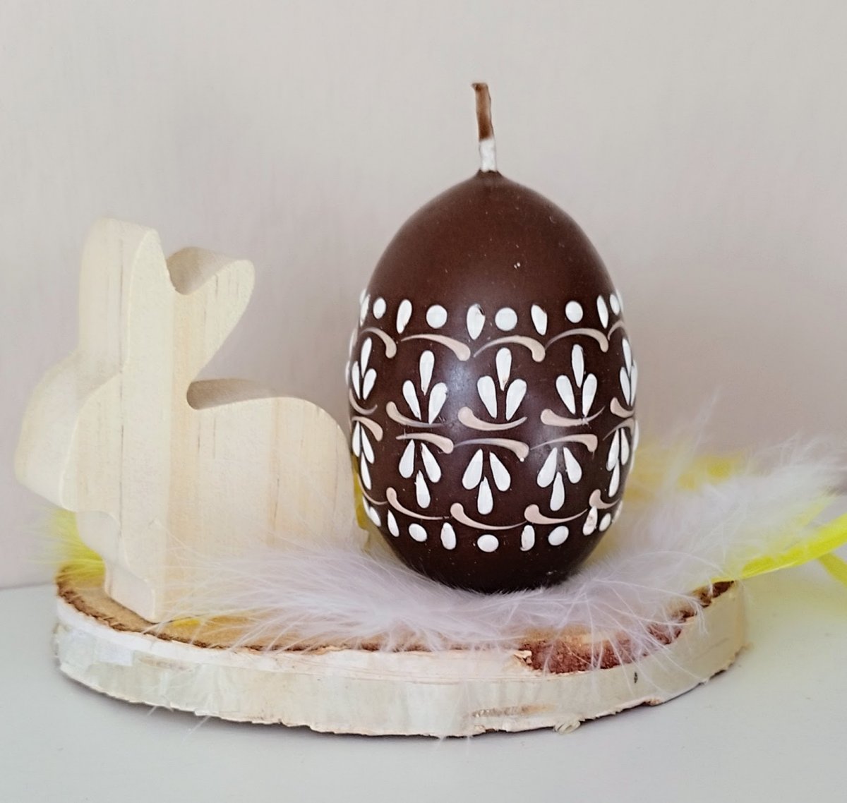 Svíčka kraslice, ručně zdobená horkým voskem, stejnou metodou, jako se zdobí klasické kraslice.
